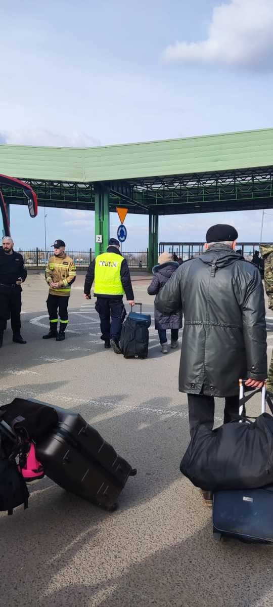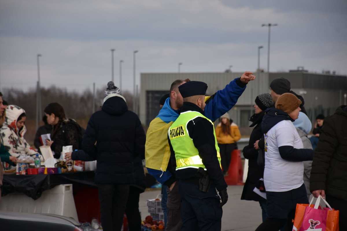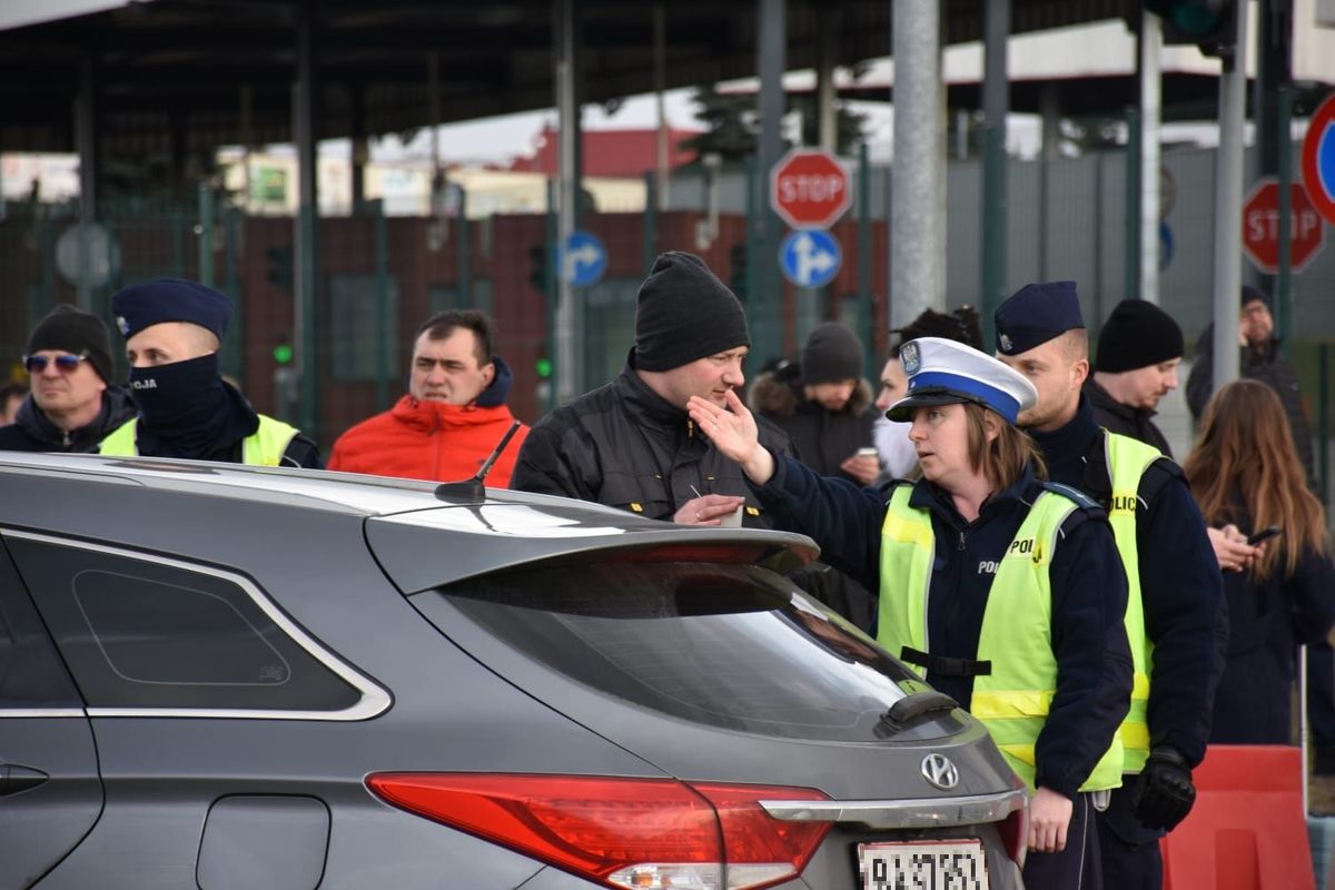 Bardzo wiele samochodów przejeżdża przez granicę, ale też sporo osób oczekuje po polskiej stronie, by odebrać swoich bliskich i dać im schronienie. Policjanci ruchu drogowego organizują ruch tak, by mógł odbywać się płynnie. Zapewniają, aby wszystkie drogi były przejezdne i nie dochodziło do zdarzeń drogowych.