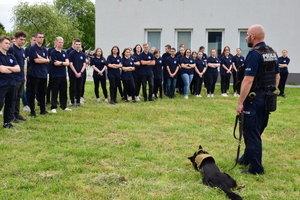 Następnym punktem programu było spotkanie z policyjnym psem tropiącym i jego przewodnikiem. Uczestnicy spotkania dowiedzieli się jak powinni zachować się w kontakcie z psem, zwłaszcza obcym oraz jakie techniki obronne należy zastosować w przypadku ataku groźnego psa.