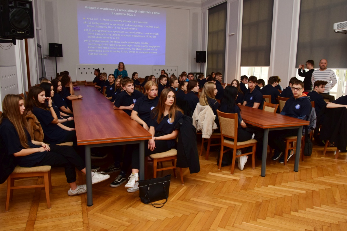 St. asp. Jerzy Ossoliński z Wydziału Prewencji Komendy Wojewódzkiej Policji w Rzeszowie omówił odpowiedzialność prawną nieletnich w świetle nowych przepisów. Przestrzegał przed konsekwencjami niezgodnych z prawem zachowań, przedstawił także środki wychowawcze, które wobec nieletnich może zastosować sąd rodzinny. Szczególną uwagę policjant zwrócił na zjawisko hejtu i przemocy, a także na konsekwencje publikacji w sieci zdjęć rówieśników bez ich zgody.