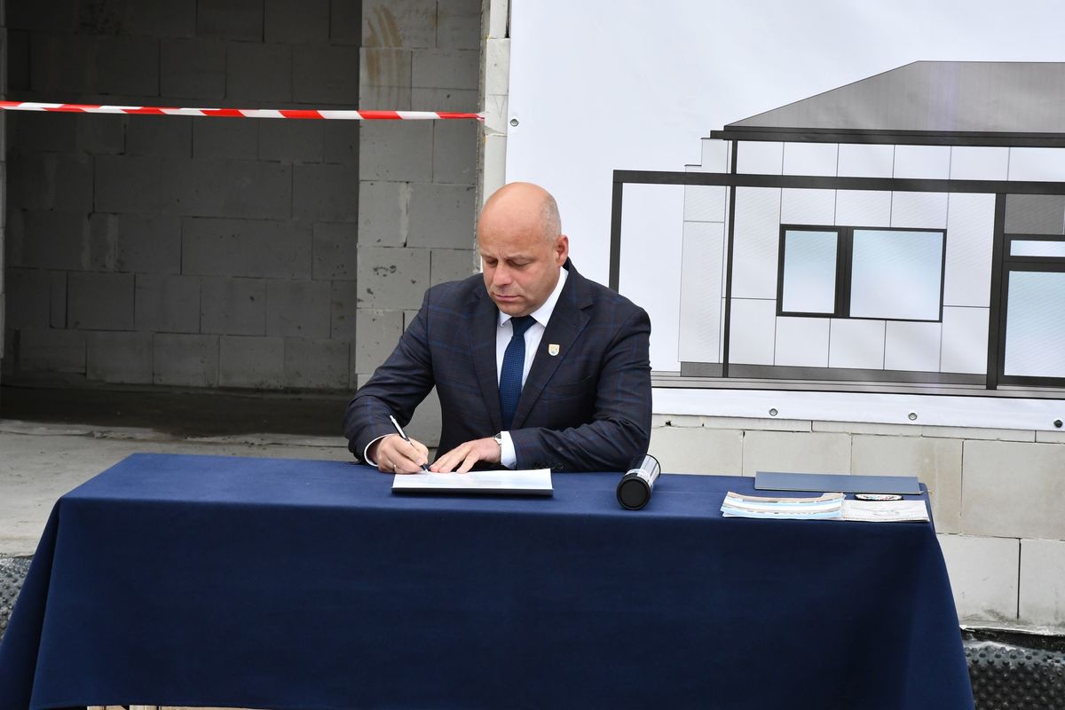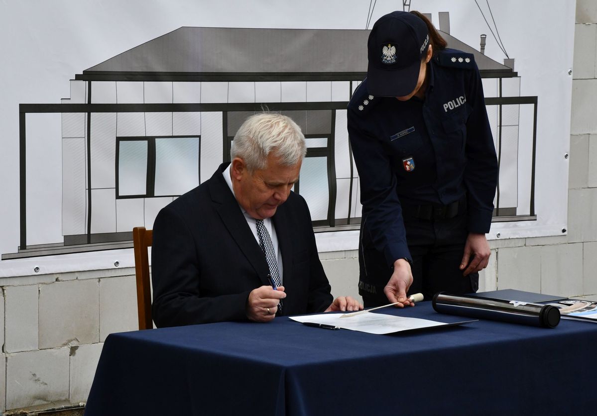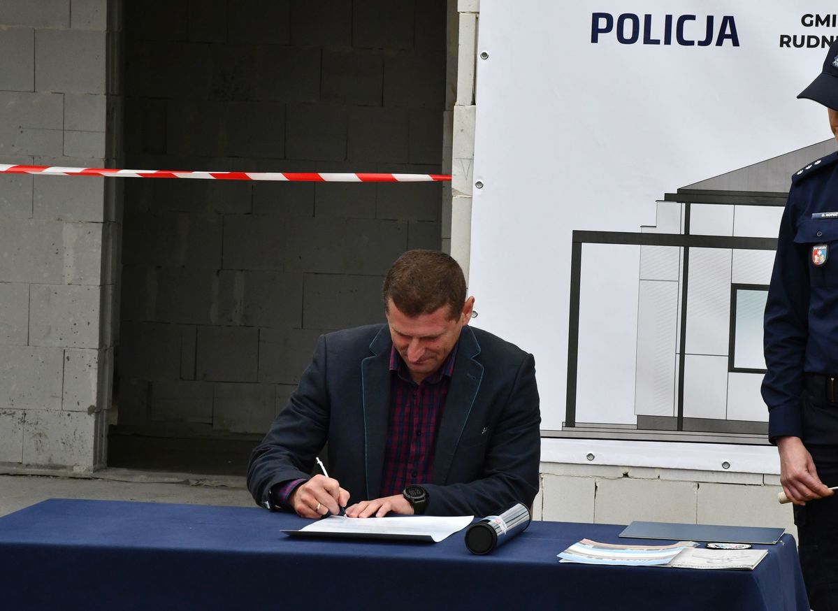 Wczoraj na placu budowy odbyło się uroczyste podpisanie aktu erekcyjnego. Swoje podpisy na dokumencie złożyli: nadinsp. Dariusz Matusiak Komendant Wojewódzki Policji w Rzeszowie, insp. Stanisław Sekuła I Zastępca Komendanta Wojewódzkiego Policji w Rzeszowie, nadkom. Dariusz Szybiak Komendant Powiatowy Policji w Nisku, Janina Sagatowska senator RP, Marcin Chodorek przedstawiciel Sekretarza Stanu w Ministerstwie Infrastruktury Rafała Webera, Agnieszka Kopacz Dyrektor Biura Poselskiego Jerzego Paula, Wojewodę Podkarpackiego reprezentował Dyrektor Wydziału Bezpieczeństwa i Zarządzania Kryzysowego Bogdan Mazur, Starosta Niżański Robert Bednarz, Burmistrz Miasta i Gminy Rudnik nad Sanem Waldemar Grochowski, Przewodniczący Rady Miejskiej w Rudniku nad Sanem Edward Wołoszyn, Naczelnik Wydziału Inwestycji i Remontów KWP w Rzeszowie Beata Gołda oraz Mariusz Rak - przedstawiciel Firmy Budowlano-Handlowej RAK Sp.j.