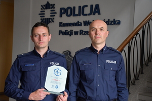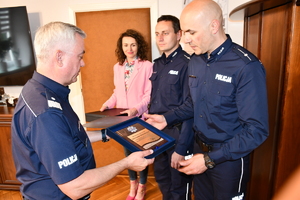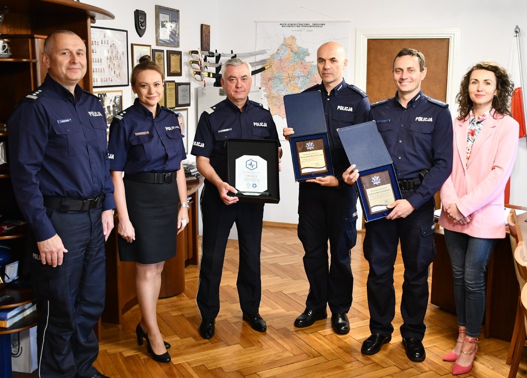 Nadinsp. Dariusz Matusiak Komendant Wojewódzki Policji w Rzeszowie, chcąc osobiście pogratulować zwycięzcom, spotkał się dziś z nimi w swoim gabinecie. W towarzystwie ich dowódcy insp. Jacka Maślanki, Naczelnik Wydziału Kadr i Szkolenia mł. insp. Magdy Bator oraz Wiolety Szczepanik Koordynatora Ratownictwa Medycznego Policji Komendy Wojewódzkiej Policji w Rzeszowie, wręczył policjantom pamiątkowe grawertony.