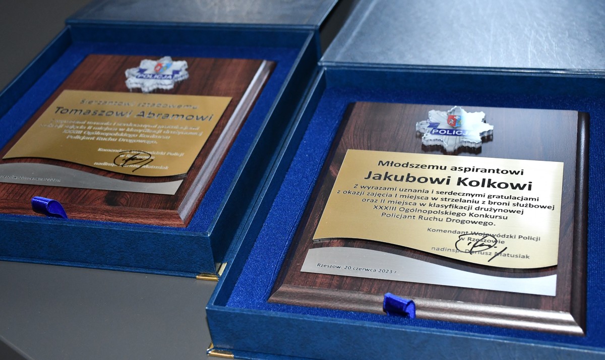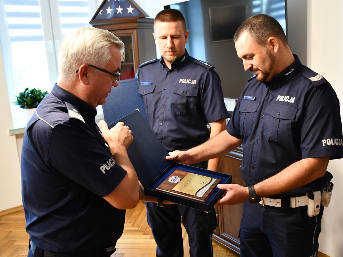Nadinsp. Dariusz Matusiak Komendant Wojewódzki Policji w Rzeszowie, osobiście pogratulował policjantom w swoim gabinecie. W obecności insp. Bogusława Kani Komendanta Miejskiego Policji w Rzeszowie, insp. Marka Mendonia Komendanta Powiatowego Policji w Łańcicie oraz podinsp. Roberta Marszałka Naczelnika Wydziału Ruchu Drogowego KWP w Rzeszowie, wręczył policjantom pamiątkowe grawertony.