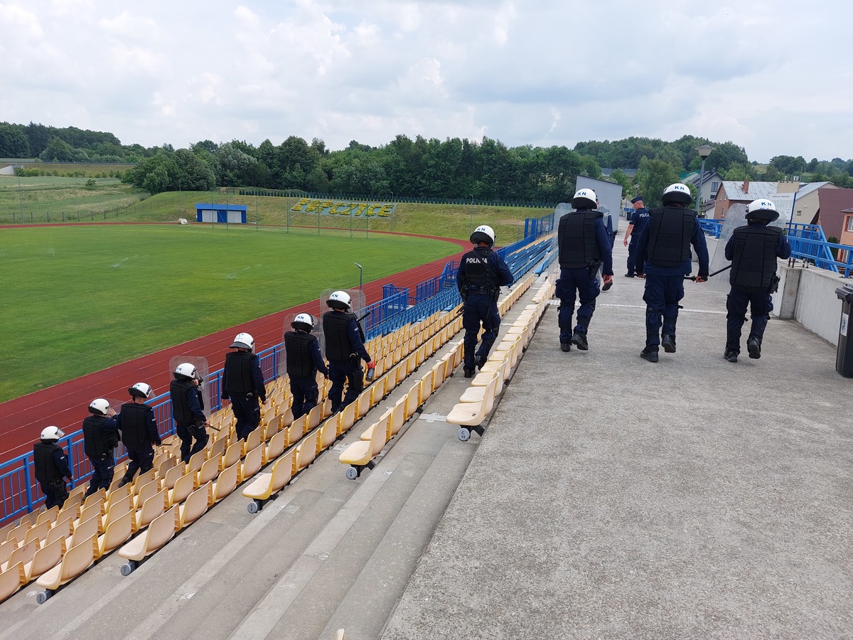 Policjanci, wyposażeni w kaski, tarcze i środki przymusu bezpośredniego, ćwiczyli warianty przywracania naruszonego ładu i porządku na stadionie. Tworzyli szyki zabezpieczające i wypierające, które stosowane są podczas działań pododdziałów zwartych.