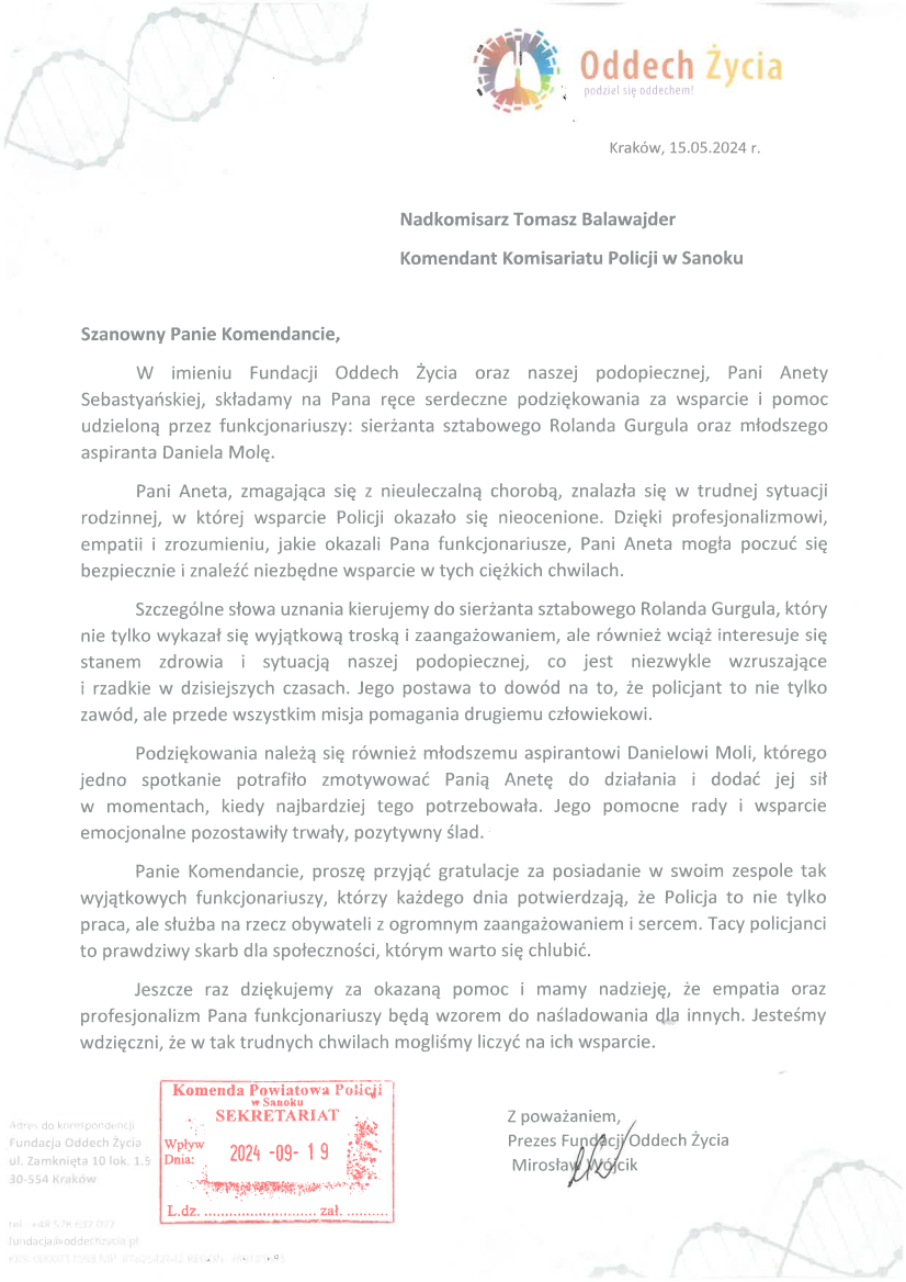 Postawa sanockich dzielnicowych spotkała się z uznaniem Prezesa Fundacji Oddech Życia. W przesłanym do komendy liście Pan Mirosław dziękuje za udzieloną pomoc podopiecznej fundacji. Słowa, które dają większą motywację do działania na rzecz obywateli, są najlepszą zapłatą za służbę.