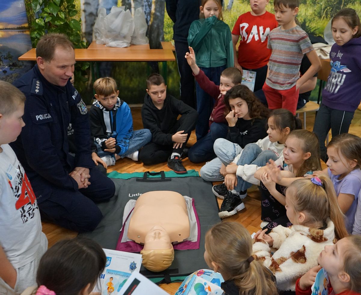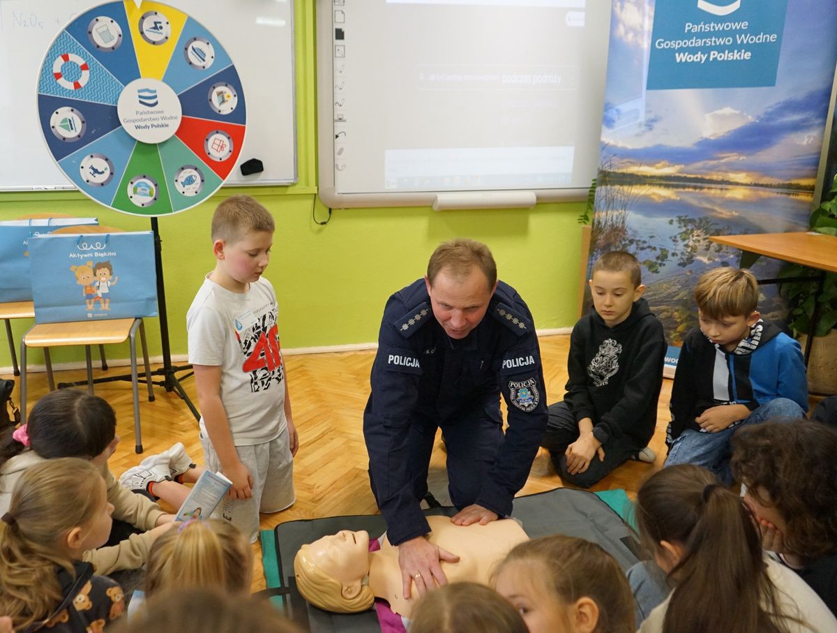 Podczas pogadanki policjanci przekazali dzieciom bezcenne informacje na temat bezpiecznej rekreacji wodnej i udzielania pierwszej pomocy. Umiejętność udzielania pierwszej pomocy często decyduje o życiu poszkodowanego, dlatego edukujemy uczniów jak zachować się w czasie niebezpiecznych sytuacji, jakie mogą zdarzyć się nad wodą i nie tylko.