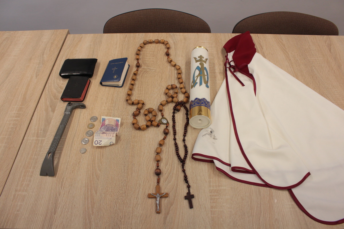 Policjanci prowadząc czynności ustalili, że sprawca odwiedził Klasztor, aby się wyspowiadać, jednak zmienił swoje plany. Najpierw usiłował zabrać datki z kościelnej skarbonki, a następnie ukradł przedmioty liturgiczne takie jak drewniane różańce, świecie i pelerynę.