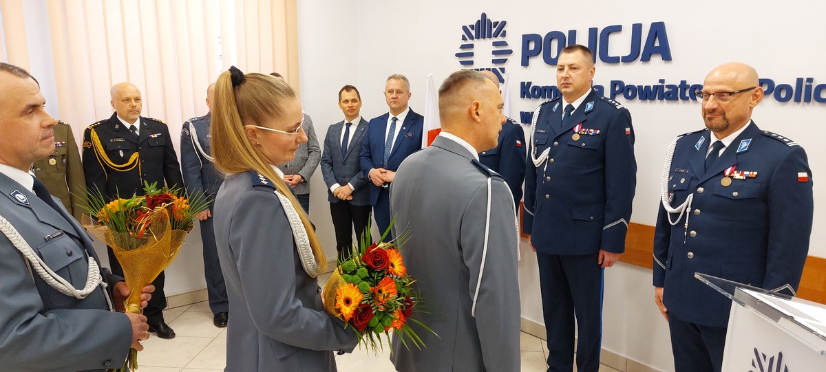 Po zakończeniu oficjalnej części uroczystości, podinsp. Marcin Stelmach, kom. Marek Lenczowski oraz asp. sztab. Paulina Pietrzyk-Kwiatkowska, wręczając kwiaty, podziękowali za współpracę insp. Jerzemu Mazurowi i przywitali nowego Komendanta.