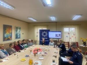 Kolejno mł. asp. Ewelina Ziemba - profilaktyk społeczny z Komendy Powiatowej Policji w Mielcu, omówiła specyfikę oszustw na „wnuczka”, „policjanta”, „pracownika banku” oraz „amerykańskiego żołnierza”. Przedstawiła również zasady bezpieczeństwa w ruchu drogowym oraz zaprezentowała interaktywne narzędzie, jakim jest Krajowa Mapa Zagrożeń Bezpieczeństwa. Asp. Anna Chrząszcz - dzielnicowa z Komisariatu Policji w Radomyślu Wielkim, przybliżyła uczestnikom program „Dzielnicowy bliżej nas” oraz aplikację „Moja Komenda”. Omówiła także plany priorytetowe realizowane przez dzielnicowych na terenie miasta i gminy Radomyśl Wielki.