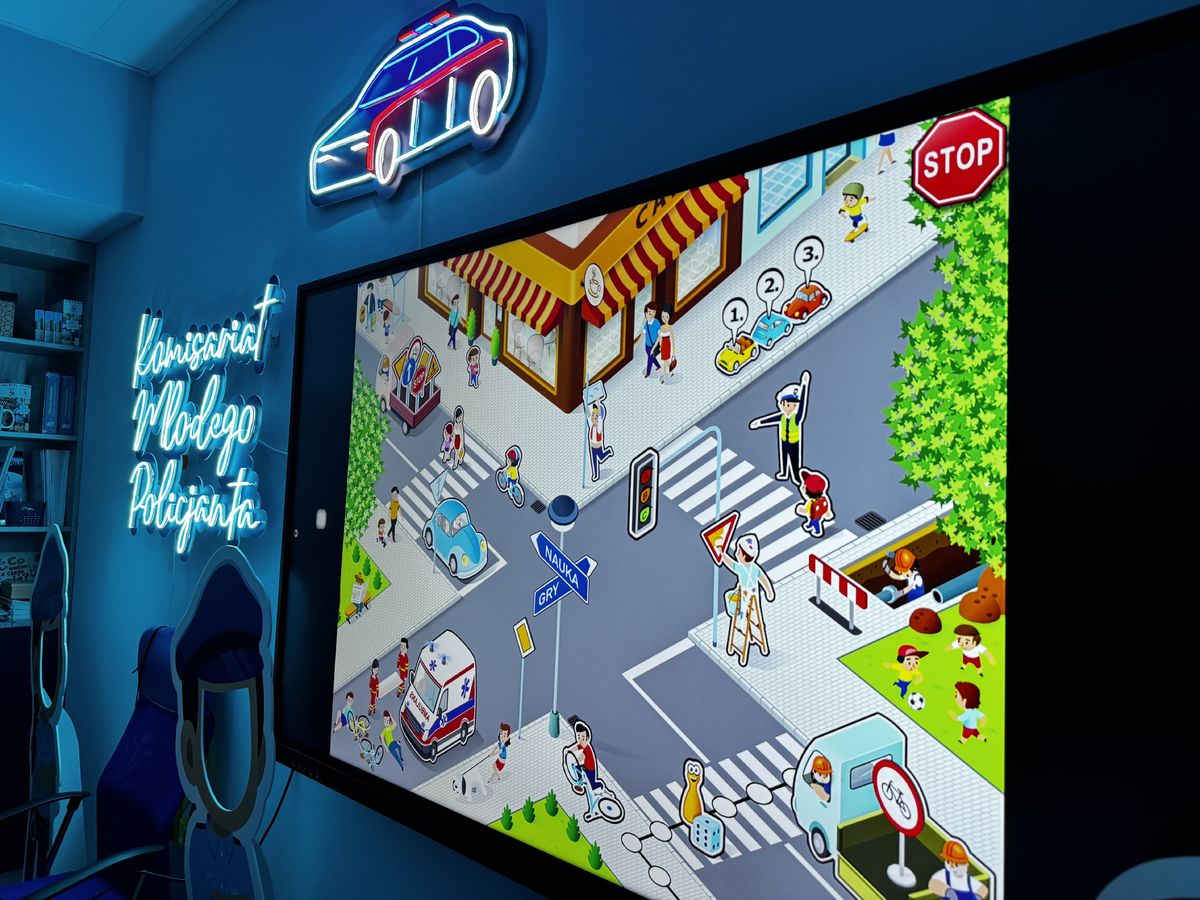 - podłoga interaktywna FunFloor wraz z pakietem „karta rowerowa” - zestaw 10 gier, które wprowadzają w tematykę ruchu drogowego, ucząca znaków drogowych oraz zasad bezpieczeństwa w ruchu drogowym,