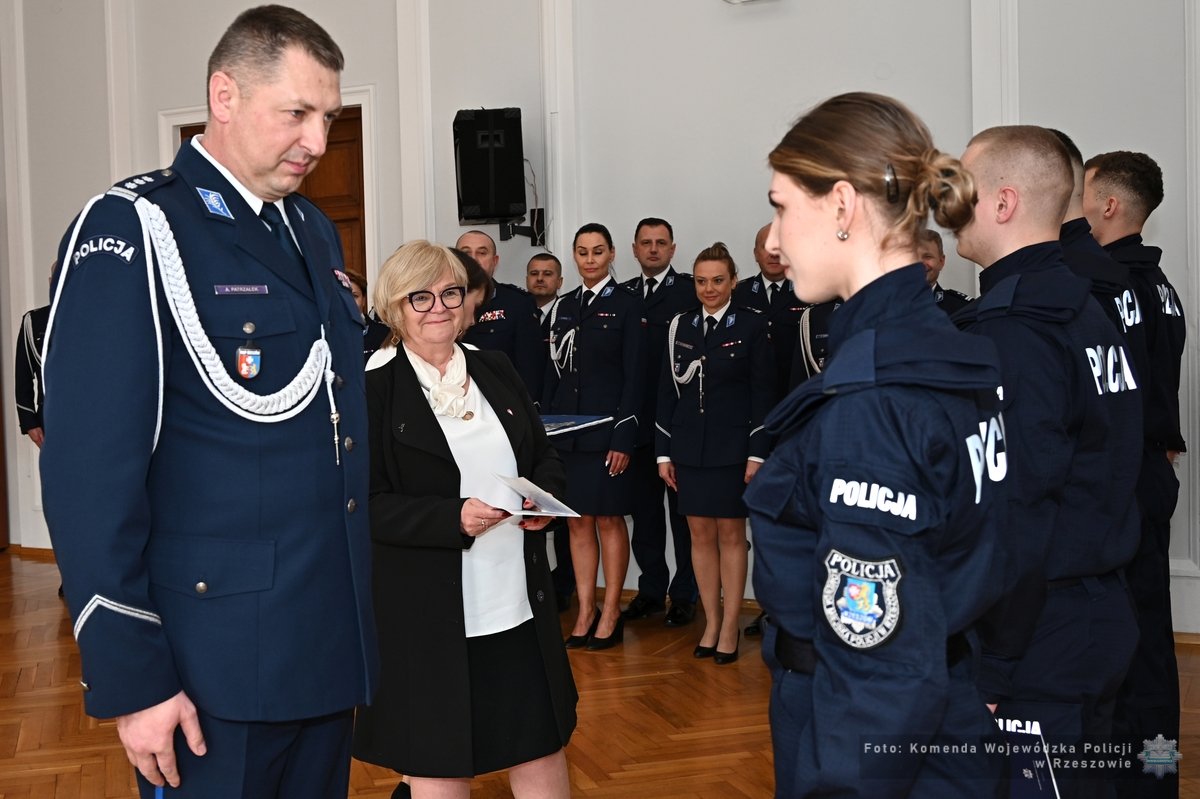 Gratulacje i życzenia policjantom i policjantkom złożyła także Wojewoda Podkarpacki Teresa Kubas-Hul. W słowach kierowanych do funkcjonariuszy podziękowała za wybór tak odpowiedzialnej profesji. Podkreśliła, że służba w Policji niesie ze sobą ogromną odpowiedzialność, ale także daje ogromną satysfakcję, płynącą z ochrony życia i mienia obywateli. Do życzeń i gratulacji przyłączył się także Paweł Wiśniewski, który odczytał list od Marszałka Województwa Podkarpackiego Władysława Ortyla skierowany do nowych funkcjonariuszy.