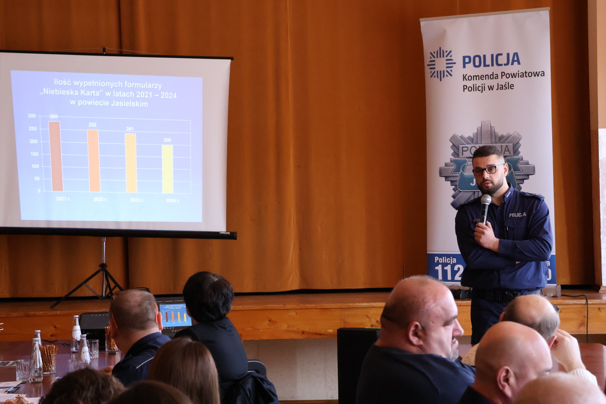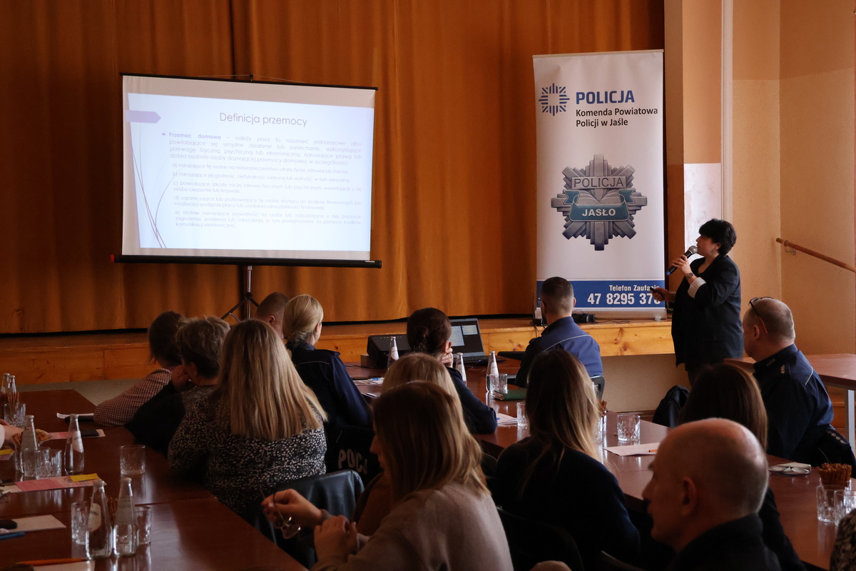 Jako pierwsza głos zabrała nadkom. Elżbieta Siupik, która poruszyła aspekty prawne dotyczące zjawiska przemocy domowej. Później swoje wystąpienia miała Magdalena Maculak, która przedstawiła zjawisko przemocy domowej w kontekście psychologicznym. Jako ostatni przemawiał asp. Rafał Gotfryd. Funkcjonariusz przedstawił statystyki dotyczące przemocy domowej na terenie powiatu jasielskiego i gminy Krempna.