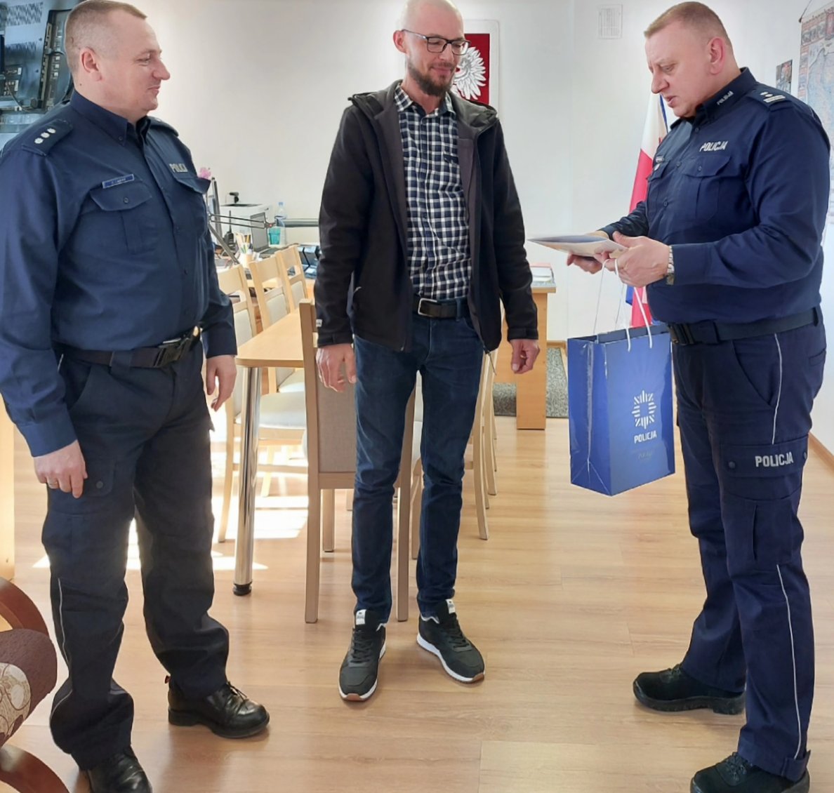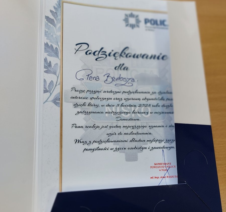 Wczoraj, Komendant Powiatowy Policji w Nisku mł. insp. Artur Wasiuta wraz ze swoim zastępcą kom. Damianem Łasakiem, pogratulowali czujności i godnej naśladowania postawy mieszkańcowi powiatu janowskiego. Szef niżańskich funkcjonariuszy podkreślił, że zdecydowana reakcja mężczyzny przyczyniła się do uniknięcia tragedii na drodze, do jakiej mógł doprowadzić nietrzeźwy kierowca. W podziękowaniu, Komendant wręczył list gratulacyjny oraz upominek życząc Panu Bartoszowi zdrowia i sukcesów.