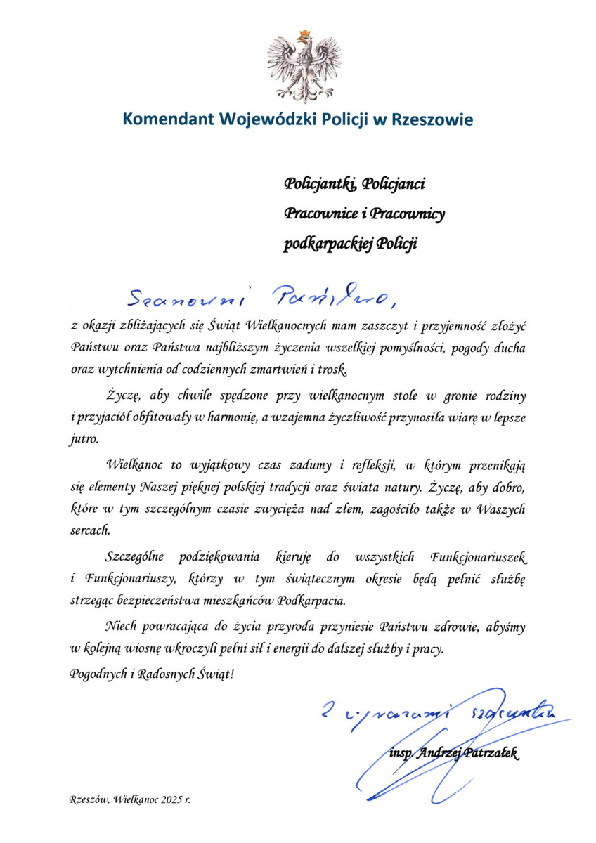 Z okazji Świąt Wielkanocnych Komendant Wojewódzki Policji w Rzeszowie inspektor Andrzej Patrzałek złożył życzenia policjantkom, policjantom, pracownicom i pracownikom podkarpackiej Policji.