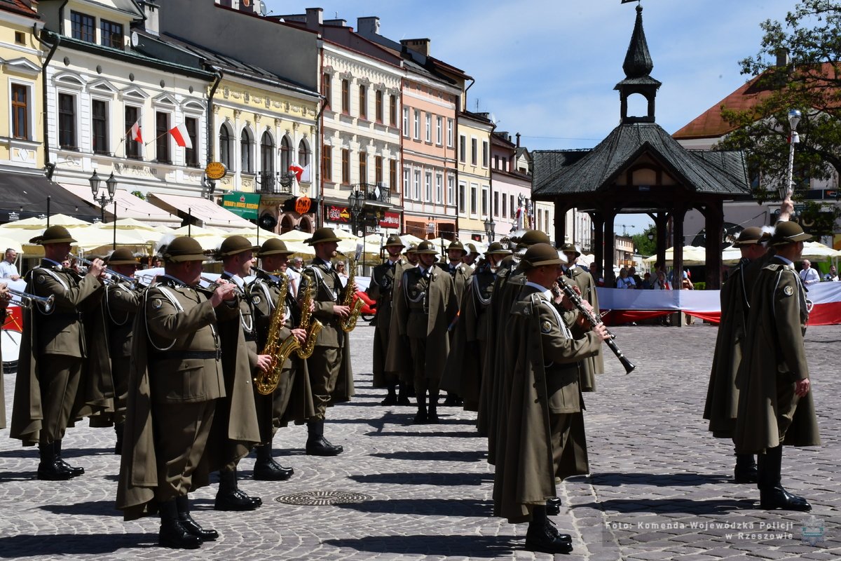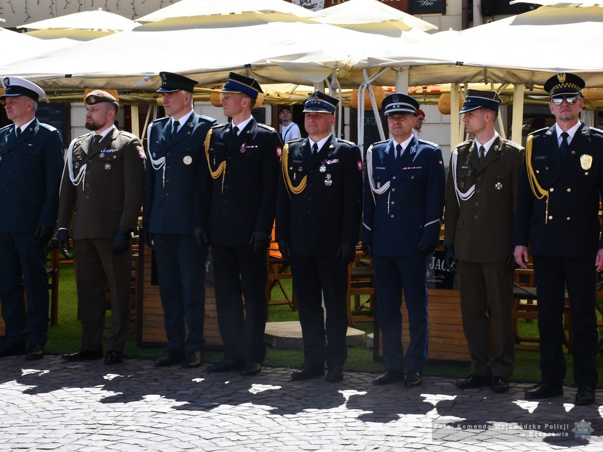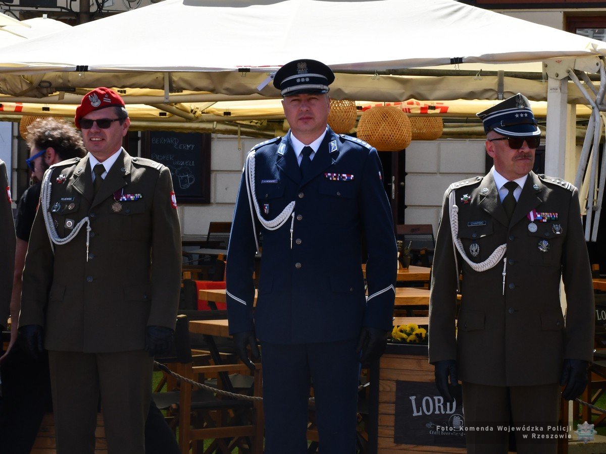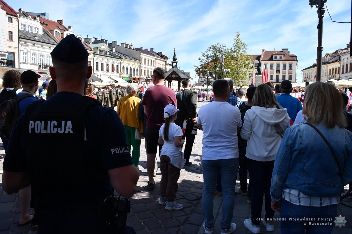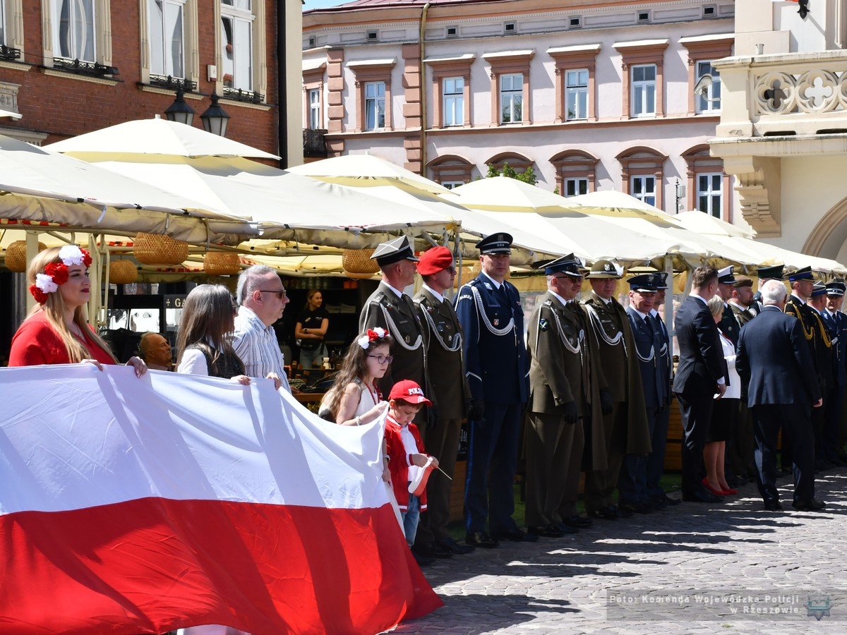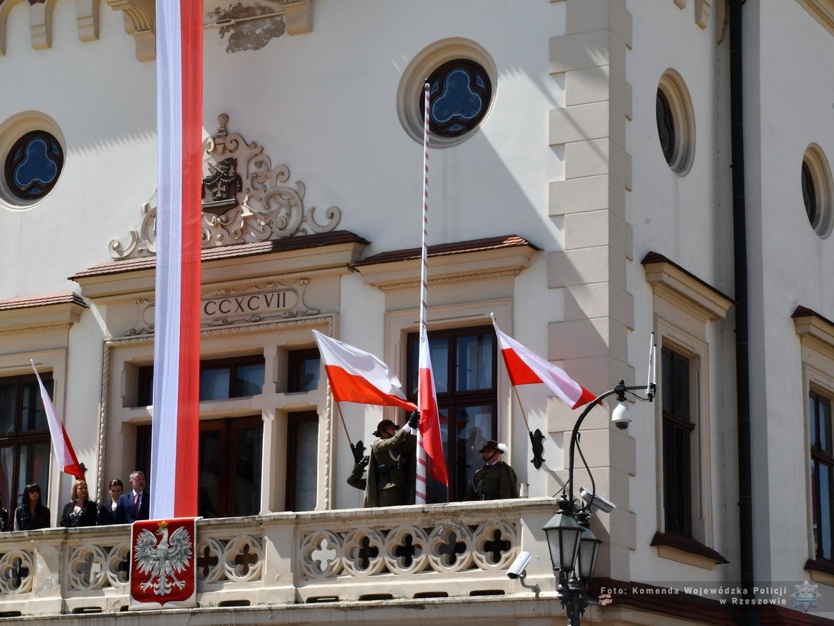 Dzisiaj w południe na rzeszowskim rynku rozpoczęły się uroczyste obchody Dnia Flagi. Przy dźwiękach hymnu państwowego wciągnięto na maszt biało-czerwoną flagę. W uroczystościach wzięli udział przedstawiciele władz samorządowych, administracyjnych oraz służb mundurowych. Policję reprezentowali insp. Andrzej Patrzałek Komendant Wojewódzki Policji w Rzeszowie oraz mł. insp. Marek Pietrykowski - Komendant Miejski Policji w Rzeszowie.