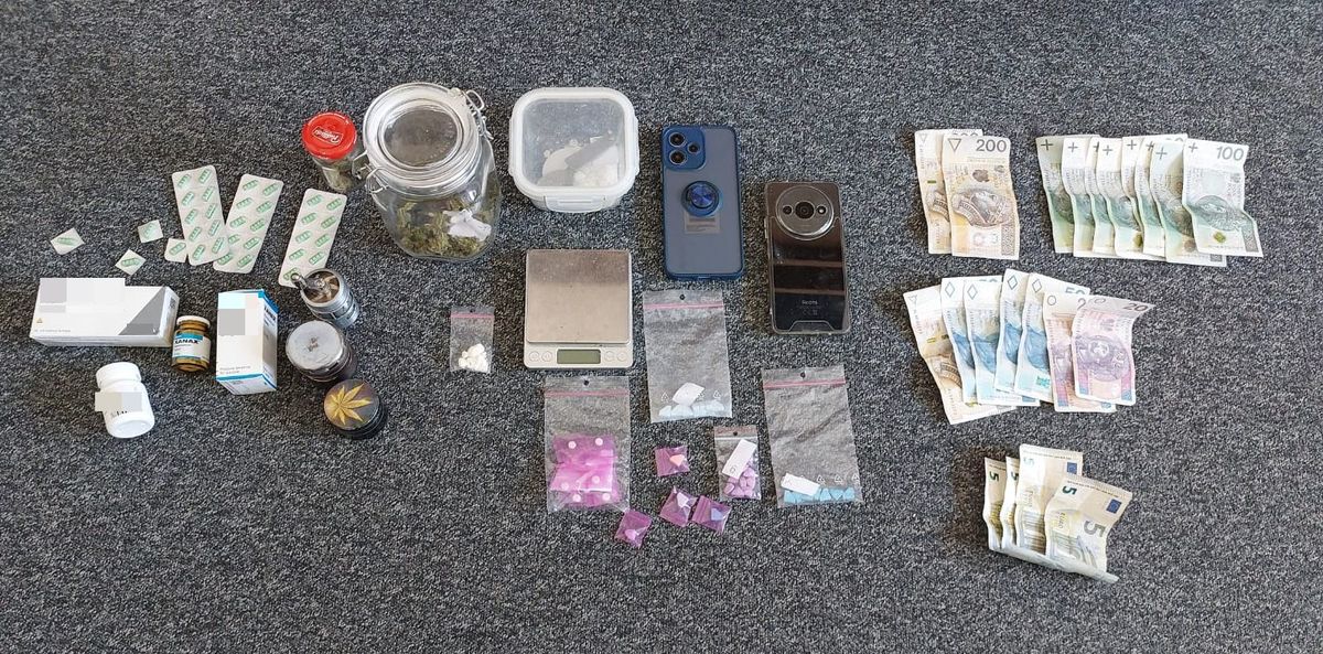 Podczas przeszukania zajmowanego przez niego lokalu policjanci znaleźli słoik z suszem roślinnym młynek i wagę. Ponadto w zamrażarce i szafkach kuchennych ujawnili kolejne narkotyki. Po wstępnych badaniach policjanci ustalili, że najprawdopodobniej jest to mefedron i amfetamina. Łącznie prawie 18 gramów środków odurzających oraz 27 tabletek ekstazy i 136 różnego rodzaju tabletek o działaniu psychotropowym. W związku z tym 26–latek został zatrzymany i przewieziony do rzeszowskiej komendy. Po wykonaniu wstępnych czynności został osadzony w policyjnej izbie zatrzymań.