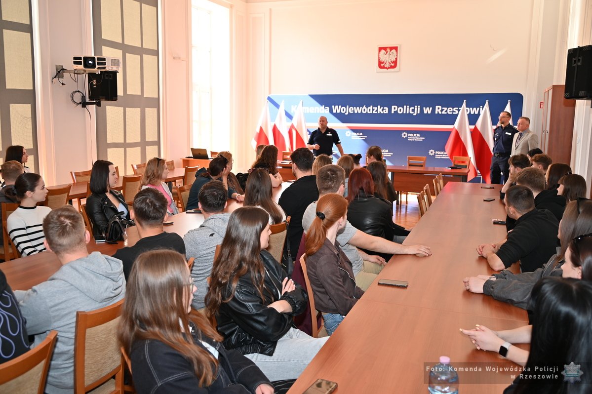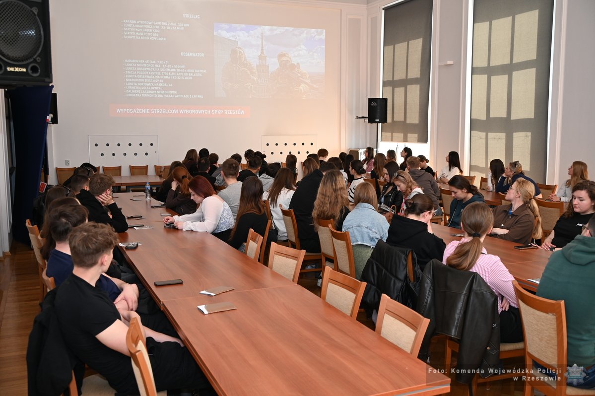 Studenci Wydziału Nauk Społecznych Uniwersytetu Rzeszowskiego odwiedzili Komendę Wojewódzką Policji w Rzeszowie. Młodzi ludzie mieli okazję porozmawiać z funkcjonariuszami na tematy dotyczące m.in. bezpieczeństwa w ruchu drogowym, jak przeciwdziałać zjawisku handlu ludźmi oraz to, czym zajmują się policyjni kontrterroryści.