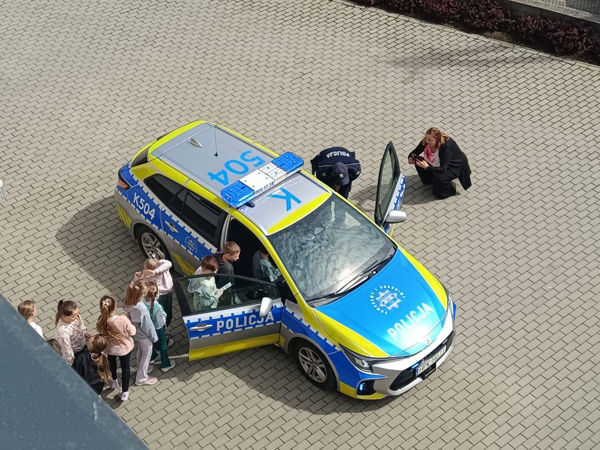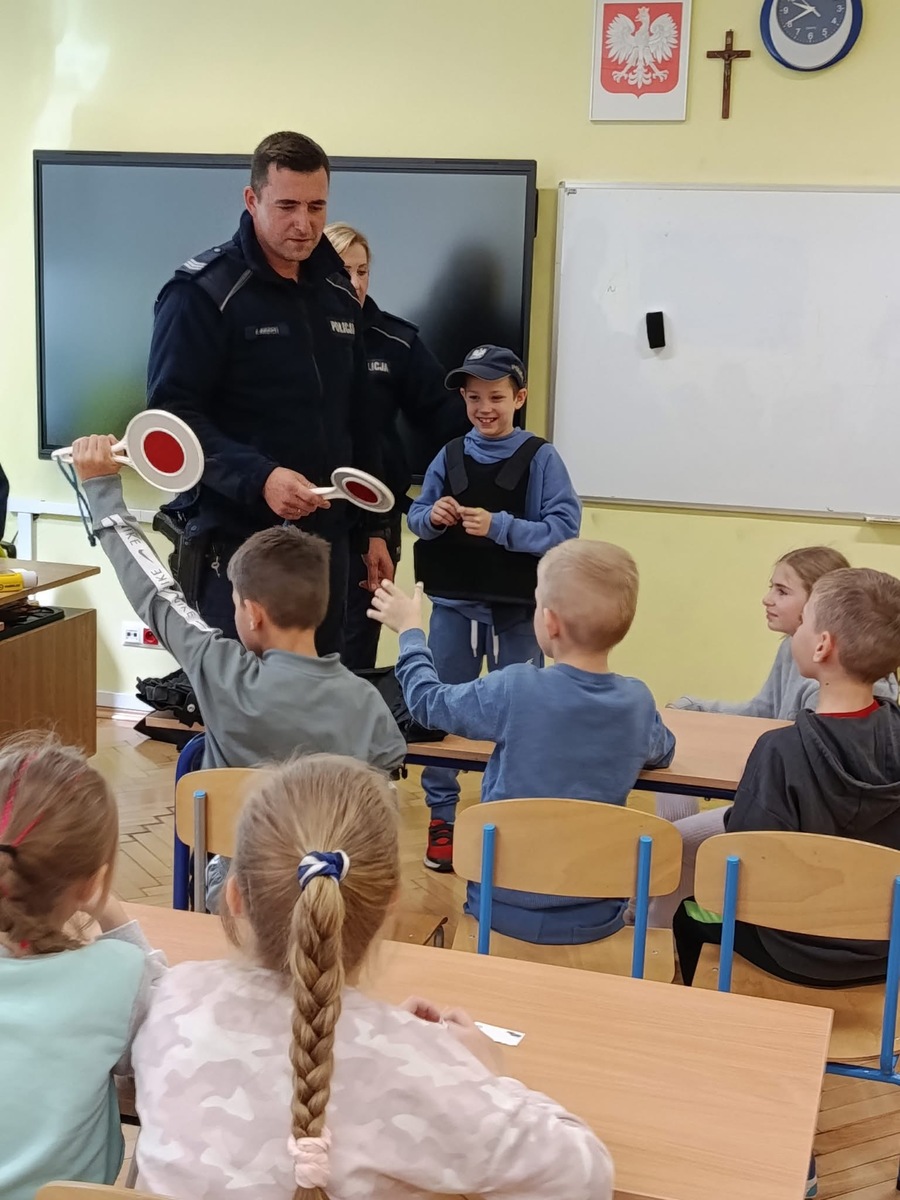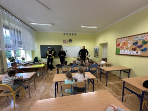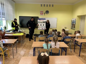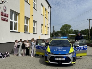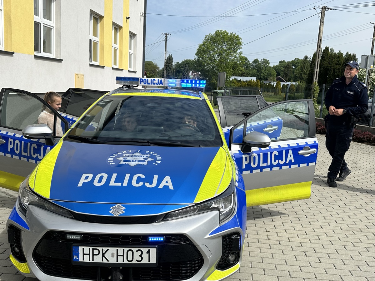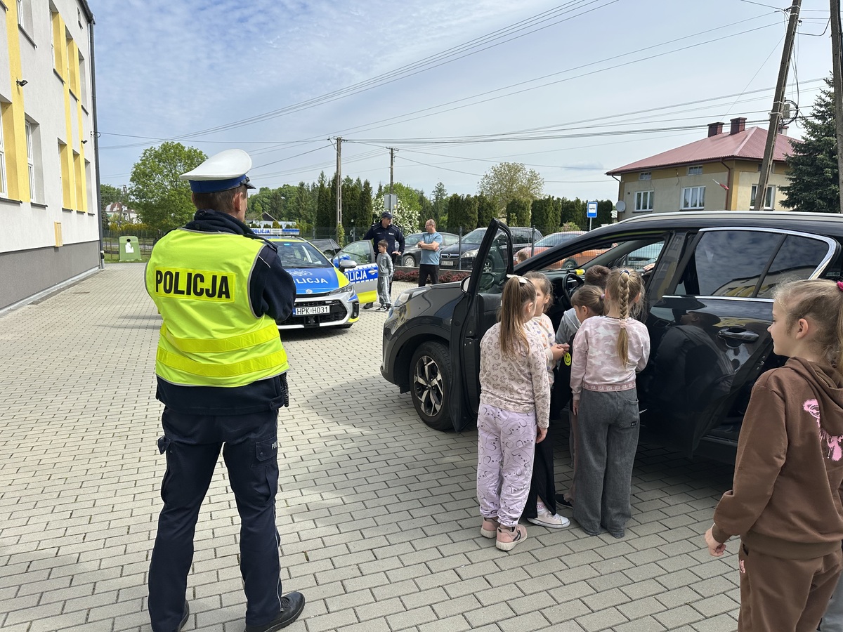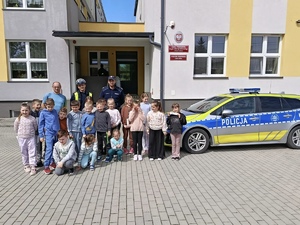 Na zakończenie spotkania funkcjonariusze zaprezentowali uczniom jaki sprzęt na co dzień używają policjanci. Dzieci miały również możliwość usiąść w policyjnym radiowozie i przez chwilę poczuć się jak policjant.