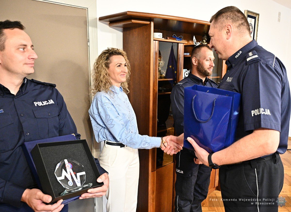 Insp. Andrzej Patrzałek Komendant Wojewódzki Policji w Rzeszowie, chcąc osobiście pogratulować policjantom sukcesu, spotkał się dziś z nimi w swoim gabinecie. Wyrażając uznanie za ich doświadczenie, wiedzę oraz umiejętności w udzielaniu pierwszej pomocy oraz za osiągnięty wynik w ogólnopolskich zawodach, wręczył pamiątkowe grawertony. Słowa podziękowania skierował również do Wiolety Szczepanik - Koordynatora Ratownictwa Medycznego Policji Komendy Wojewódzkiej Policji w Rzeszowie.