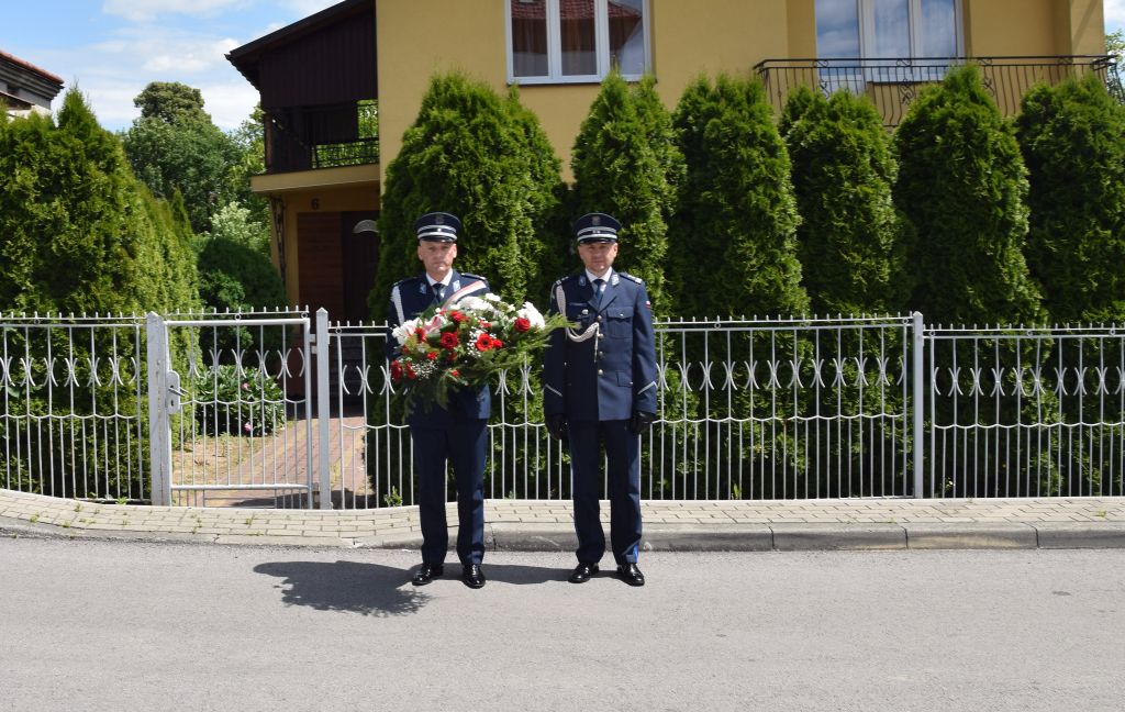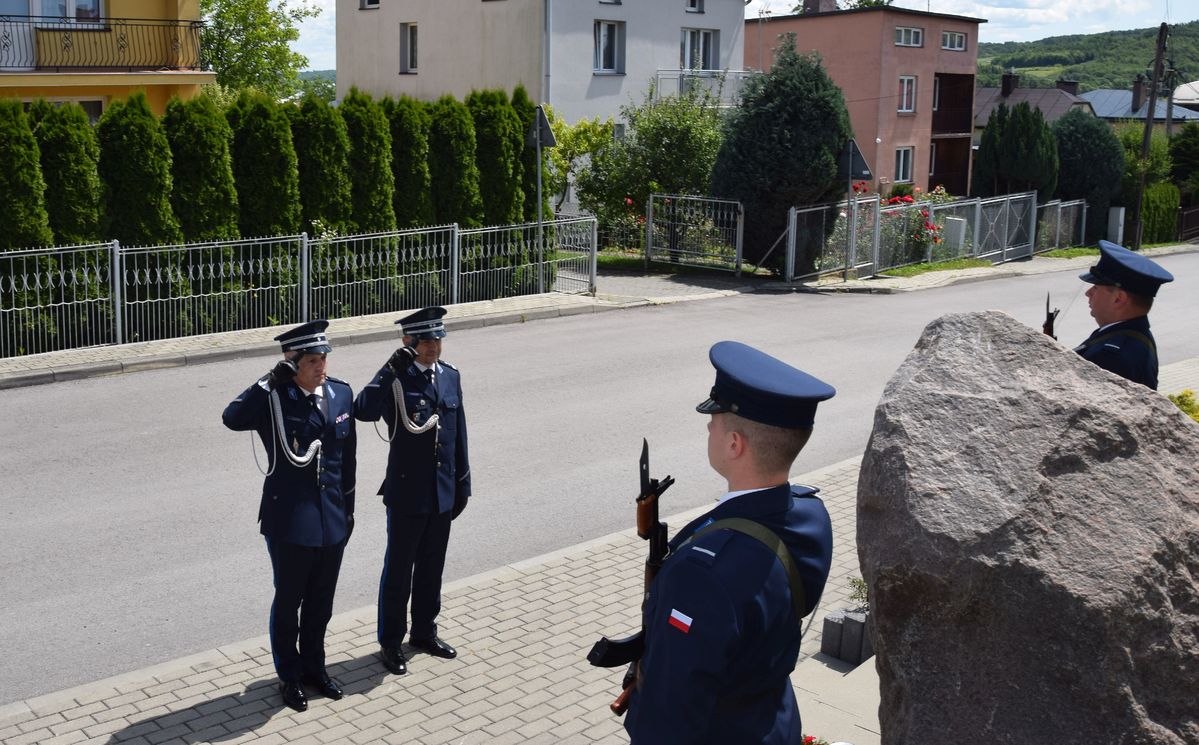 Komendant Powiatowy Policji w Jarosławiu podinsp. Jan Wojtowicz wraz z Zastępcą mł. insp. Markiem Hajdukiem, złożyli kwiaty przed upamiętniającą tablicą umieszczoną na kamieniu przy Komisariacie Policji w Pruchniku.