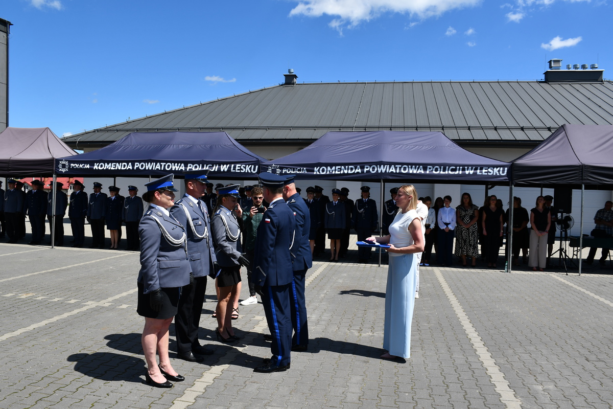 Następnie głos zabrał starosta leski Wojciech Stelmach, który w imieniu przedstawicieli lokalnego samorządu skierował w stronę policjantów słowa uznania i pogratulował awansów. Głos zabrał również insp. w st. spocz. Wiesław Korczykowski, który wyraził wdzięczność dla roli, jaką policjanci odgrywają w tworzeniu bezpiecznego regionu. Podziękowania za pełną zaangażowania służbę na rzecz bezpieczeństwa najmłodszych mieszkańców powiatu leskiego złożyła reprezentująca Towarzystwo Przyjaciół Dzieci Anna Sopata, która wyróżniła komendantów wspierających pracę TPD odznaką „Przyjaciel Dziecka”.