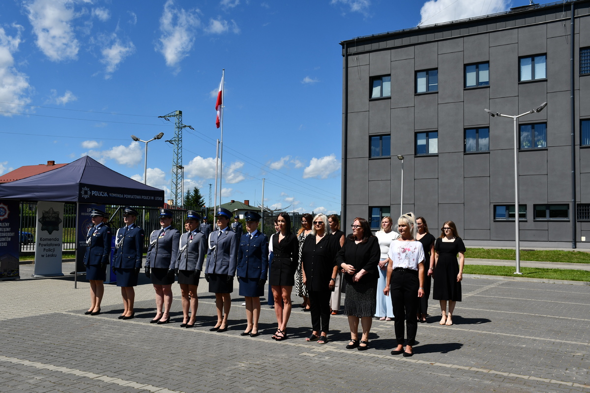 Wszystkich zgromadzonych przywitał Komendant Powiatowy Policji w Lesku mł. insp. Grzegorz Koczera. Komendant w swoim przemówieniu podkreślił, jak ważny jest etos policyjnej służby i jakim wyróżnieniem jest noszenie policyjnego munduru. Podczas wystąpienia Komendant złożył również podziękowania dla wszystkich samorządowców, przedstawicieli wymiaru sprawiedliwości oraz służb mundurowych i instytucji lokalnych za wspieranie dotychczasowych inicjatyw Policji związanych z działaniem na rzecz poprawy stanu bezpieczeństwa mieszkańców naszego powiatu. Komendant przypomniał też, że w tym roku mija 100 lat, od kiedy kobiety pełną służbę w polskiej Policji. Z okazji tego wyjątkowego jubileuszu przekazał wyrazy najwyższego szacunku oraz podziękowania dla wszystkich pań, policjantek i pracownic Policji za profesjonalizm oraz ogromny wkład w dbanie o bezpieczeństwo obywateli i gości naszego powiatu. Miłym akcentem było wyróżnienie pamiątkowymi medalami wszystkich pracujących w Komendzie Powiatowej Policji w Lesku pań.