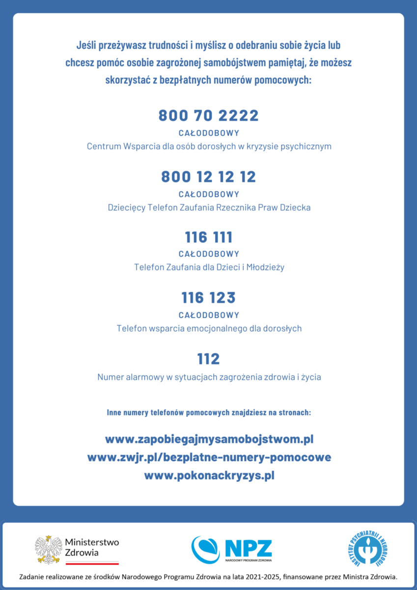 Na terenie całego kraju można dzwonić na numer alarmowy 112 lub Kryzysowy Telefon zaufania pod nr 116 123 oraz Młodzieżowy Telefon Zaufania pod nr 116 111. Pamiętajmy również, że w każdym powiecie funkcjonują instytucje, do których można zwrócić się o wsparcie w ciężkich chwilach.