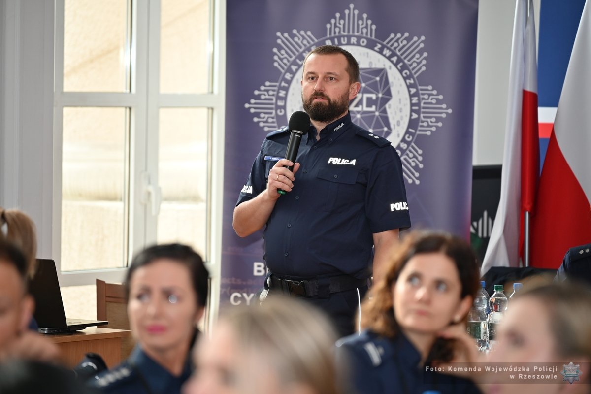 W pierwszej kolejności głos zabrali funkcjonariusze Zarządu w Rzeszowie Centralnego Biura Zwalczania Cyberprzestępczości. Podkom. Piotr Marek, Naczelnik Wydziału Informatyki Śledczej przedstawił zagadnienia związane z pozyskiwaniem informacji o aktualnych zagrożeniach w sieci. W swoim wystąpieniu podkreślił, że wraz z intensywnym rozwojem technologii i postępującej cyfryzacji naszego życia wiedza policjantów w tym zakresie jest niezbędnym elementem przy dostosowywaniu działań prewencyjnych i profilaktycznych. Następnie podkom. Karolina Dykas i asp. Anna Wójcik wskazały na kierunkową profilaktykę związaną z cyberbezpieczeństwem, ze szczególnym uwzględnieniem bezpieczeństwa dzieci i młodzieży. Celem wystąpienia było ujednolicenie przekazu profilaktycznego dostosowanego do różnych grup wiekowych. Jednym z istotniejszych zagadnień wskazanych podczas szkolenia były rozwiązania prawne obejmujące ochronę osób małoletnich przed krzywdzeniem, na które wskazał podkom. Kamil Boroszko, Zastępca Naczelnika Wydziału Operacyjno-Śledczego.