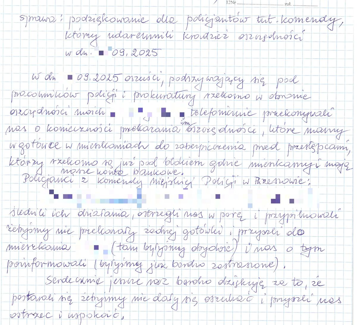Do Komendy Miejskiej Policji w Rzeszowie wpłynęły podziękowania od seniorki, która o mało co, nie została oszukana. Przestępcy, pod legendą „na policjanta” chcieli wyłudzić od niej oszczędności. Kobieta doceniła zaangażowanie funkcjonariuszy, co wyraziła w przesłanym do nas liście.