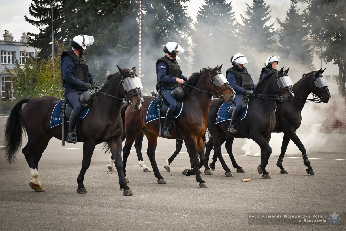 Trzydniowy egzamin składał się m.in. z elementów ujeżdżenia na parkurze, na którym konie i jeźdźcy pokonywali ustawione przeszkody i sprawdzaniu umiejętności wierzchowców podczas współdziałania z pododdziałem zwartym, który tworzyli funkcjonariusze Oddziału Prewencji Policji w Rzeszowie. Natomiast na policyjnym torze przeszkód konie ćwiczyły ogólną sprawność.