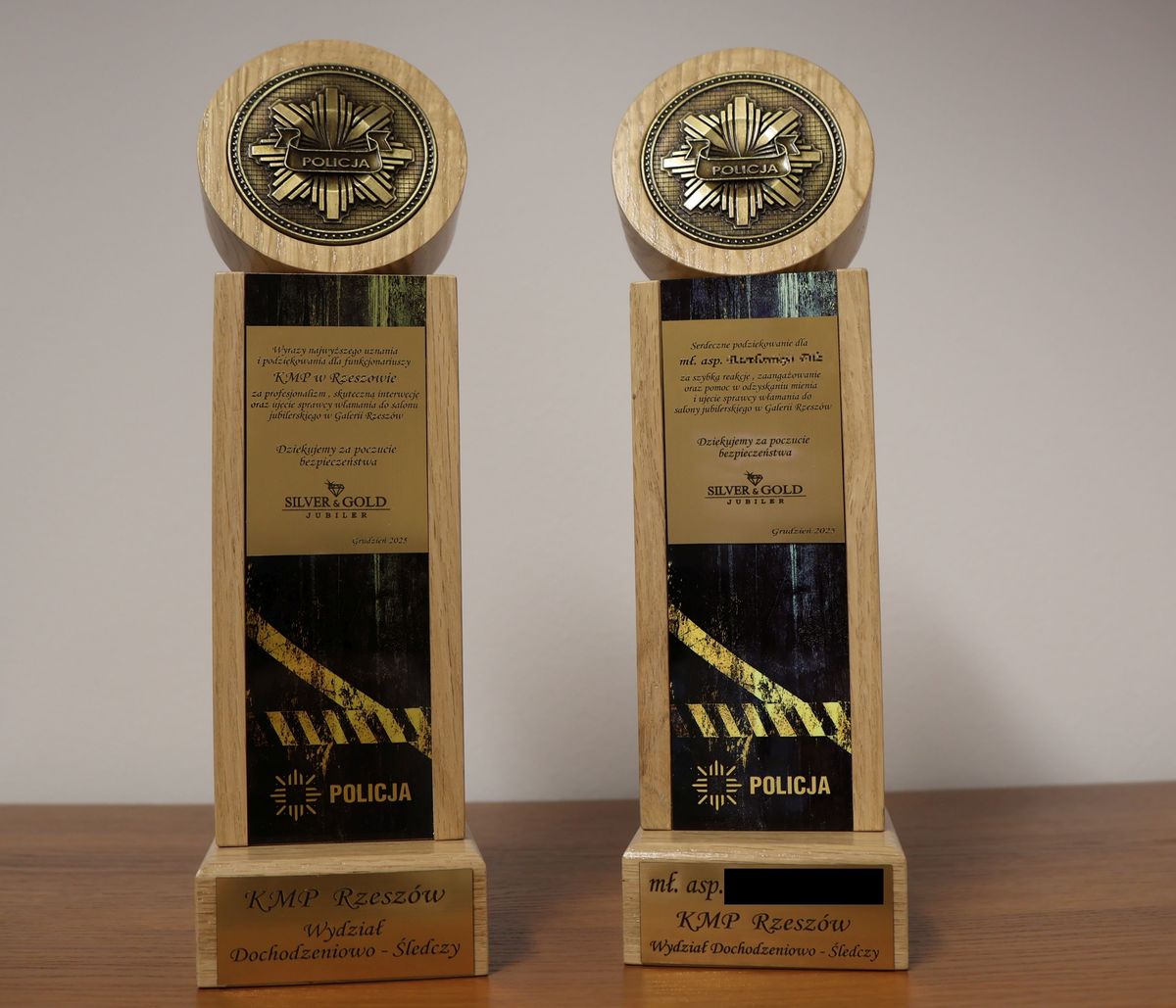 „Wyrazy najwyższego uznania i podziękowania dla funkcjonariuszy Komendy Miejskiej Policji w Rzeszowie za profesjonalizm, skuteczną interwencję oraz ujęcie sprawcy włamania (…)” wyraził właściciel jednego z salonów jubilerskich w Rzeszowie. Za pośrednictwem referenta postępowania, na ręce Komendanta Miejskiego Policji w Rzeszowie, przekazał pamiątkowe statuetki.