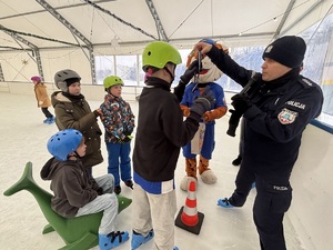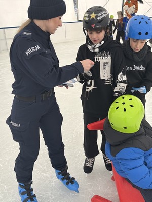 - podczas rozmów podkreślają konieczność korzystania z kasków ochronnych, zwłaszcza przez osoby początkujące i dzieci. Funkcjonariusze przypominają także, że lodowisko to nie tor wyścigowy - nadmierna prędkość i brawura zagrażają zarówno jadącemu, jak i innym użytkownikom,