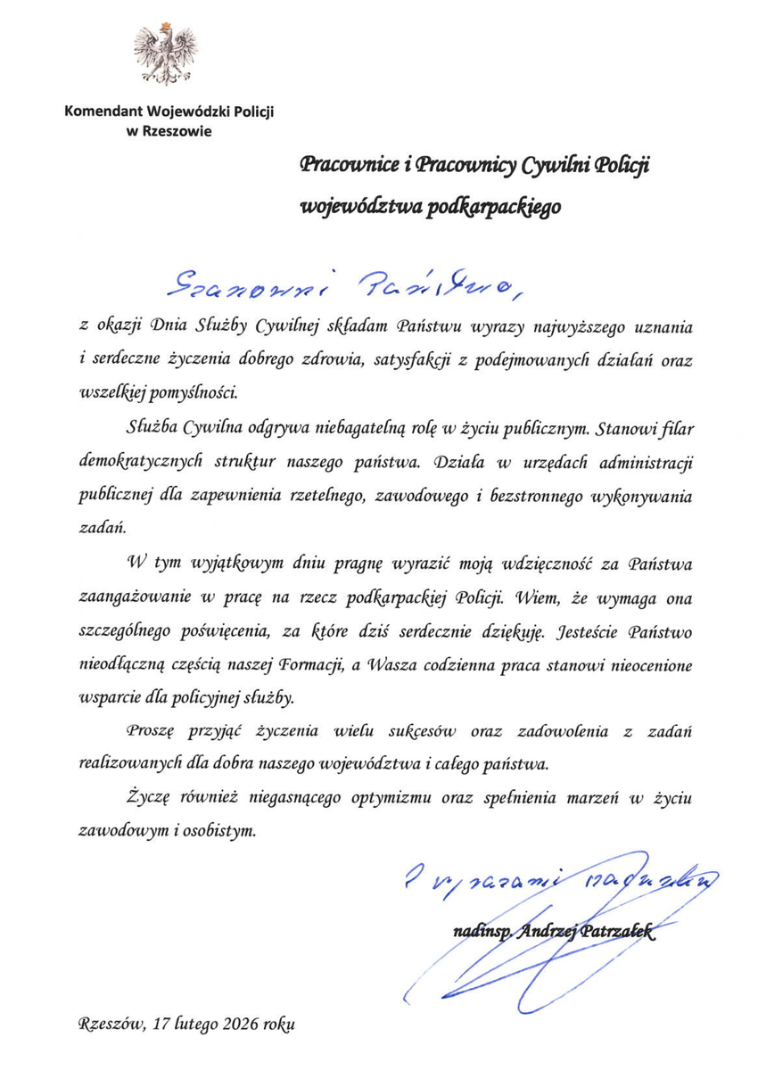 Komendant Wojewódzki Policji w Rzeszowie nadinspektor Andrzej Patrzałek składa pracownikom służby cywilnej wyrazy najwyższego uznania i serdeczne życzenia dobrego zdrowia, satysfakcji z podejmowanych działań oraz wszelkiej pomyślności.