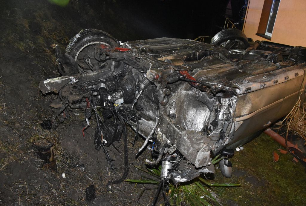 Po krótkim pościgu, na łuku drogi, kierujący stracił panowanie nad pojazdem i dachował na pobliskiej posesji. Siła uderzenia była na tyle duża, że samochód został całkowicie zniszczony. Uszkodzona została także infrastruktura drogowa, a jeden z elementów pojazdu uderzył jeszcze w dach budynku znajdującego się na posesji, gdzie doszło do dachowania.