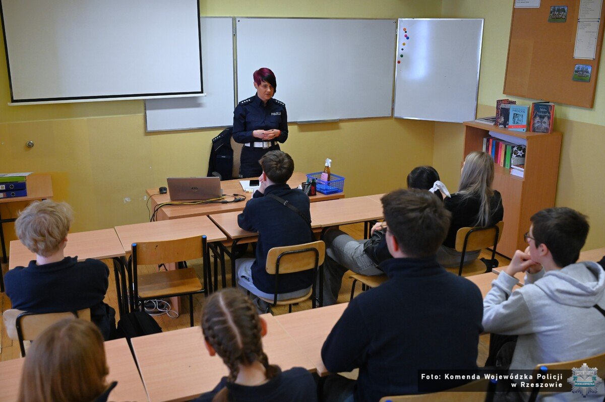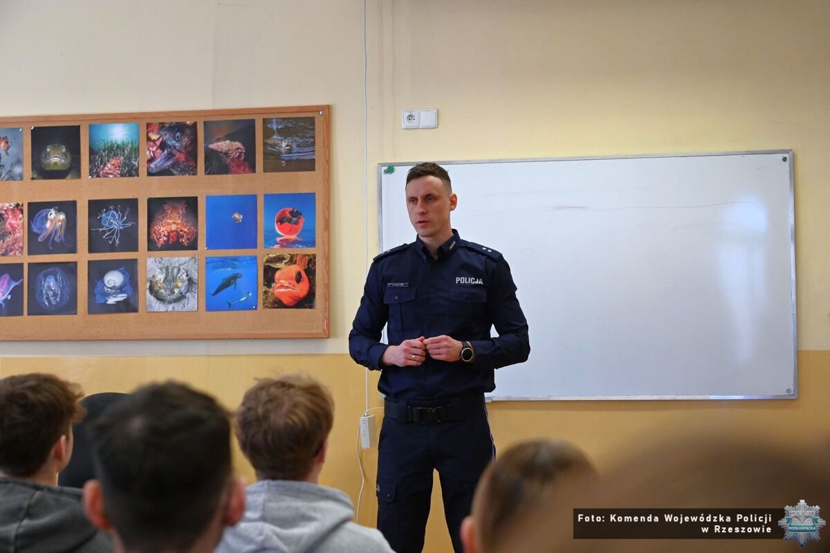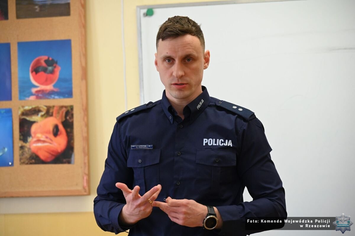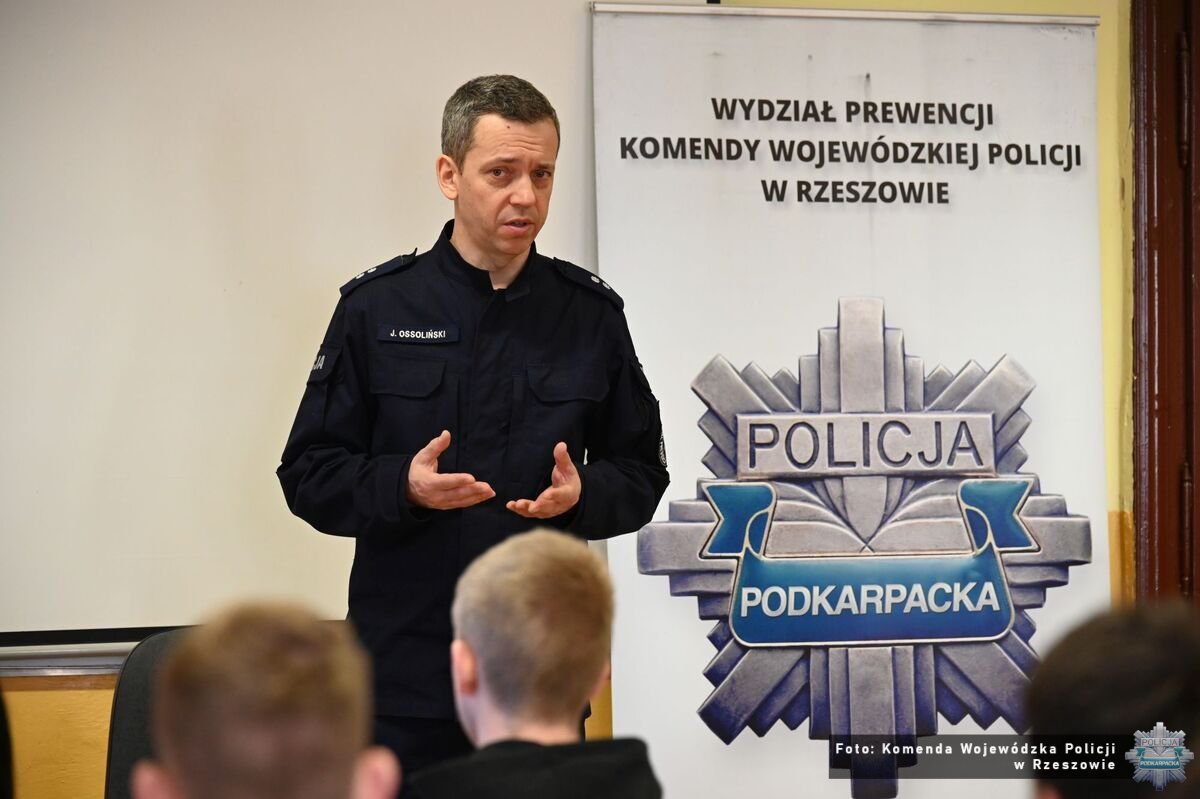 Zagadnienia dotyczące odpowiedzialności prawnej osób nieletnich przedstawił podkom. Jerzy Ossoliński z Wydziału Prewencji Komendy Wojewódzkiej Policji w Rzeszowie. Funkcjonariusz omówił najczęstsze wykroczenia i przestępstwa popełniane przez młodzież oraz wskazał możliwe konsekwencje prawne takich czynów.