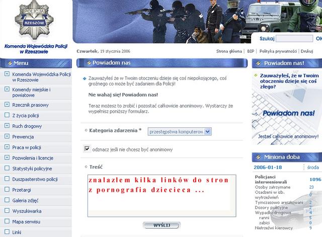 Współpraca policji Podkarpacia z policją Niemiec pozwoliła na zatrzymanie pedofila z Rzeszowa. Kilka dni wcześniej policja z Wiesbaden powiadomiła Biuro Międzynarodowej Współpracy Policji KGP w Warszawie o podejrzeniach związanych z pedofilią w Polsce południowo-wschodniej. Sprawą zajęli się zatem specjaliści z KWP w Rzeszowie. Wczoraj po południu funkcjonariusze Wydziału Kryminalnego Komendy Wojewódzkiej Policji przy współdziałaniu ze specjalnym Zespołem do Walki z Przestępczością Internetową KWP weszli do biura rzeszowskiego odziału firmy z Warszawy. Powodem wizyty było podejrzenie o posiadanie przez jednego z pracowników pornografii dziecięcej. Sprawdzono kilka służbowych komputerów. Jeden z nich nosił ślady sprowadzania pornografii dziecięcej. Na komputrze pracował 32-letni mężczyzna, który odwiedzał pornograficzne strony i ściągał z Internetu filmy. Przeszukanie jego mieszkania dowiodło, że była to ciemna strona życia mężczyzny. Policja zabezpieczyła tam kilkdziesiąt płyt z filmami i zdjęciami pornograficznymi, w tym pornografią z małymi dziećmi. Mężczyzna jest kawalerem i w otoczeniu uchodzi za przyzwoitego człowieka. Został zatrzymany przez policję pod zarzutem utrwalania i posiadania treści pornograficznych z udziałem małoletnich poniżej 15 roku życia. Za przestępstwo grozi mu do 10 lat pozbawienia wolności. Ilustracja przedstawia, jak powiadomić policję o zagrożeniu. Zawsze, jak trafisz na coś, co cię zaniepokoi, przyślij do nas wiadomość, możesz to zrobić także anonimowo!