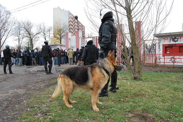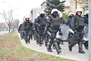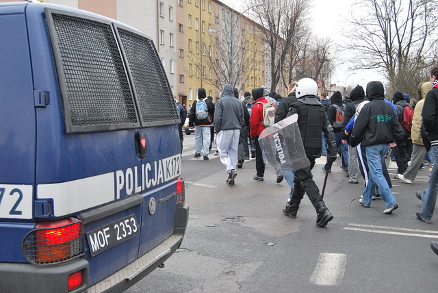 Policjanci z Podkarpacia zabezpieczali dziś dwa spotkania piłkarskie w Stalowej Woli i Rzeszowie. Mecze cieszyły się sporym zainteresowaniem kibiców. Były to imprezy tzw. podwyższonego ryzyka, z policyjnych informacji wynikało, że kibice mogą próbować zakłócić spokój. Działania Policji zapobiegły chuligańskim incydentom. Oba mecze rozpoczęły się w południe. Drugoligowa Stal ze Stalowej Woli podejmowała katowicki GKS, a trzecioligowy zespół Resovii gościł drużynę Sandecji Nowy Sącz. Do Stalowej Woli przyjechało 800 kibiców gości, w Rzeszowie Sandecję dopingowało 350 fanów. Policjanci eskortowali grupy kibiców z dworców kolejowych, na które dotarli specjalnymi pociągami, na stadiony. Po meczach odprowadzali ich na stacje. W Rzeszowie nie doszło do żadnych incydentów, w Stalowej Woli po meczu policjanci musieli dwukrotnie interweniować. Przyjezdni kibice popychali policjantów osłaniających przemarsz, uspokoili się dopiero, kiedy Policja użyła gazu pieprzowego. Po raz drugi zakłócili spokój na dworcu. Zbierali kamienie z torowiska i rzucali je w policjantów. Nie reagowali na polecenia, dlatego policjanci użyli pałek. Kamień zarysował nadwozie jednego z policyjnych radiowozów. W zabezpieczenie spotkań zaangażowani byli policjanci z wielu podkarpackich jednostek. Na zdjęciach: policjanci zabezpieczają przemarsz kibiców na stadion w Rzeszowie.