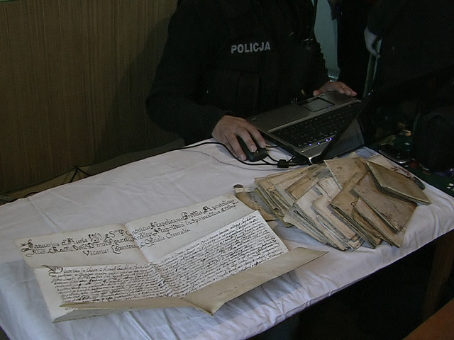 Policjanci z Centralnego Biura Śledczego w dwóch mieszkaniach w Jarosławiu zabezpieczyli kilkadziesiąt drogocennych zabytków. Są to manuskrypty i starodruki oraz inne przedmioty, z których większość powstała w późnym średniowieczu. Zabytki te pochodzą z Włoch, do Polski wwiozła je kobieta, która pracowała w tym kraju, opiekowała się starszym człowiekiem. Policjanci przed kilkoma miesiącami dowiedzieli się, że w busie jednej z linii przewozowych, na teren kraju zostały przewiezione drogocenne przedmioty z terenu Włoch. Dotarli do listy pasażerów, a przez to do osób mogących mieć z tym związek. W wyniku tych działań objęli podejrzeniem 38-letnią mieszkankę Jarosławia. W piątek policjanci weszli do dwóch mieszkań, które zajmowała w jednej z jarosławskich kamienic. Wcześniej starannie się przygotowali do zabezpieczenia przedmiotów, w tej czynności procesowej wziął udział ekspert z Biura Kryminalnego komendy głównej, zajmujący się dziełami sztuki. W realizacji uczestniczyli też specjaliści z KWP w Rzeszowie. W obu mieszkaniach funkcjonariusze znaleźli zabytkowe przedmioty. Przechowywane one były w sposób niewłaściwy, np. starodruki i manuskrypty były zwinięte w plastikowej reklamówce, która leżała w jednym z pokoi obok łóżka. W mieszkaniach zabezpieczone zostały 53 przedmioty. W najbliższym czasie trafią one do Uniwersytetu Jagiellońskiego, gdzie naukowcy wykonają szczegółowe ich oględziny. Z pierwszych ocen wynika, że większość zabytków pochodzi z późnego średniowiecza (XIV-XV w.) Są to starodruki i manuskrypty pisane na skórze, papierze czerpanym i pergaminie w trzech językach: po łacinie zapisanej gotykiem, po włosku i hiszpańsku. Najstarszy dokument prawdopodobnie pochodzi z 1307 r. Niektóre dokumenty opatrzone są pieczęciami m.in. papieża Benedykta XIV. Zabezpieczono też przedmioty z późniejszego okresu, np. księgę psalmów z XVIII w., ale też jedną, o wiele starszą monetę - sestercję z podobizną cesarza Trajana, z I w. W mieszkaniu znaleziono też biżuterię i dawno temu wykonane krzyże z metali oraz odznaczenia włoskie, jak też protezę górnej szczęki z litego złota. Policja polska zwróci się do władz włoskich o potwierdzenie pochodzenia przedmiotów, po to by rozstrzygnąć czy doszło do kradzieży lub innego przestępstwa. Przewóz zabytków i dzieł sztuki jest zabroniony. Zgodnie przepisami krajowymi i międzynarodowymi o ochronie zabytków i dzieł sztuk przemyt takich przedmiotów zagrożony jest karą do 5 lat pozbawienia wolności. Dochodzenie nadzorowane jest przez Prokuraturę Okręgową w Rzeszowie.