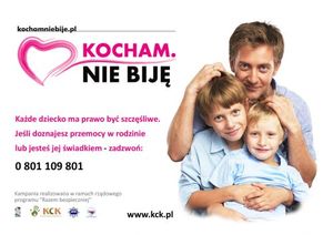 Dziś rusza kampania "Kocham. Nie biję", której celem jest m.in. przeciwdziałanie przemocy w rodzinie i ograniczanie jej skutków. Pozytywny przekaz, który zapewnią bilbordy i spoty telewizyjne przedstawiające znane osoby z dziećmi, ma promować obraz współczesnej rodziny wolnej od przemocy.Rodzice i opiekunowie powinni dawać dzieciom przykład mądrych i pozytywnych zachowań. Jednak codzienność często pokazuje, że tych zachowań brakuje samym dorosłym. Przykład tego stanowi agresja i stosowanie przemocy, zarówno wobec innych dorosłych, jak też wobec własnych dzieci. Akcja ta ma zwiększyć społeczną wrażliwość na przejawy przemocy pojawiającej się w najbliższym otoczeniu. Ma promować wartości rodzinne i obraz współczesnej rodziny wolnej od przemocy. W inicjatywę, oprócz instytucji administracji publicznej, organizacji pozarządowej i mediów, włączą się także osoby znane, przede wszystkim z telewizyjnych ekranów: Beata Chmielowska – Olech, Anna Dereszowska, Tomasz Karolak, Maciej Kurzajewski, Maria Seweryn. W ramach kampanii zostanie uruchomiona infolinia dla ofiar przemocy o numerze 0 801 109 801, która będzie obsługiwana przez pracowników Fundacji Krajowe Centrum Kompetencji. Szczegółowe informacje o kampanii „Kocham. Nie biję”.