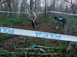 Dziś, krośnieński sąd, na wniosek Policji i prokuratury aresztował na trzy miesiące 43-letniego mężczyznę podejrzanego o podwójne zabójstwo. Wczoraj, ciała zamordowanych odnaleziono w okolicach Bukowska. Były zakopane w lesie.Krośnieńska Policja poszukiwała 35-letniego mieszkańca Iwonicza od kilku tygodni. Mężczyzna, 15 października br. wyjechał rano do stadniny koni w okolicach Puław (gm.Rymanów). Był w towarzystwie swojego kolegi, 28-letniego mieszkańca Rzeszowa. Pojechali po odbiór konia, który miał być zapłatą za pracę w stadninie. Gdy mężczyzna nie wrócił do domu, zaniepokojona rodzina zgłosiła zaginięcie. Podobnie postąpili też najbliżsi rzeszowianina. Od chwili przyjęcia zgłoszenia, policjanci rozpoczęli poszukiwania obu mężczyzn. Sprawdzono szereg wersji, także to, że wyjechali za granicę lub ulegli nieszczęśliwemu wypadkowi. W akcji poszukiwawczej, policjantom pomagali strażacy, funkcjonariusze Straży Granicznej, goprowcy i rodziny zaginionych. Sprawdzono m.in. tereny leśne nieopodal Puław oraz dno zalewu w Sieniawie.Policjanci dotarli też do właściciela stadniny, do którego wybrali się mężczyźni. Trzy dni temu weszli na teren gospodarstwa i drobiazgowo go przeszukali. Zabezpieczono szereg dowodów, potwierdzających związek gospodarza z zaginięciem obydwu mężczyzn. Piotr M. został zatrzymany.Wczoraj, podczas przesłuchania,43-latek przyznał się do zabójstwa Bogdana K. i Marcina D. Wskazał miejsce, w którym ukrył zwłoki. Ciała zakopane były w trudno dostępnym miejscu, na głębokości ok. 1,5 metra. Dziś rodzina potwierdziła ich tożsamość. Sekcja wykaże przyczynę ich śmierci.Także wczoraj, po południu, w Przemyślu odnaleziono samochód należący do jednego z zaginionych mężczyzn. Był zaparkowany przy jednej z ulic w centrum miasta.Więcej o tej sprawie przeczytasz na stronie KMP w Krośnie.