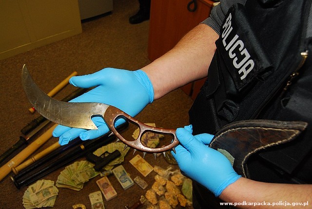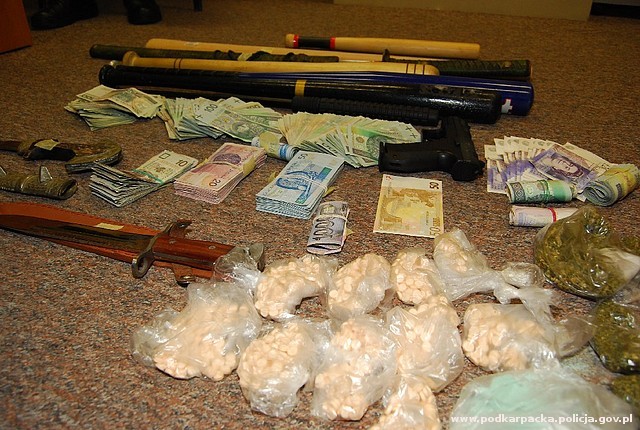 Szef gangu został również zatrzymany. W mieszkaniu tego „bezrobotnego” funkcjonariusze znaleźli i zabezpieczyli pieniądze, również funty brytyjskie i euro oraz walutę jednego z krajów bałkańskich. Łączna ich wartość to ponad 40 tys. zł. Podczas działań policjanci zabezpieczyli też narkotyki: ponad 1200 tabletek ekstazy oraz około 100 gramów marihuany. W domach podejrzanych policjanci znaleźli przedmioty służące do przemocy, porachunków i „ustawek”: kije bejsbolowe i pałki, noże, kastety, miecz imitujący samurajski i atrapę broni ostrej. Na poczet przyszłych kar zabezpieczone zostały samochody podejrzanych, o łącznej wartości 230 tys. zł.