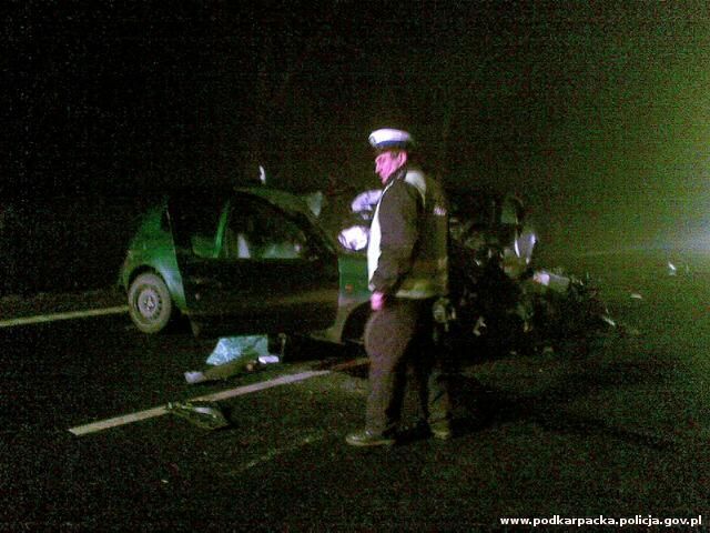 Nie żyje 25-letni kierowca renaulta clio, pięć innych osób zostało rannych w zderzeniu dwóch samochodów osobowych. Do wypadku doszło dziś około godz. 21 w Cmolasie, w powiecie kolbuszowskim. Jak wstępnie ustalono, kierujący renaultem chcąc uniknąć zderzenia z innym pojazdem gwałtownie hamował, wpadł w poślizg i czołowo zderzył się z nadjeżdżającą hondą accord. Pasażer renaulta i cztery osoby jadące hondą, w tym 4-letnie dziecko przebywają w szpitalu.