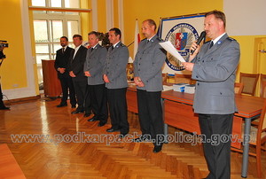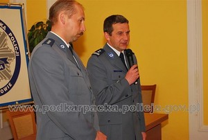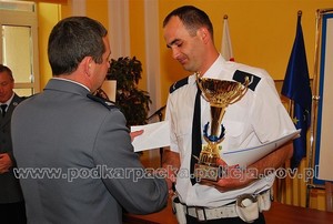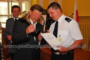 Sierż. szt. Dariusz Górecki odbiera nagrodę z rąk Podkarpackiego Komendanta Wojewódzkiego Policji w Rzeszowie insp. Józefa Gdańskiego -