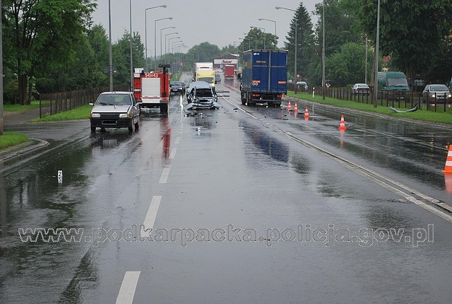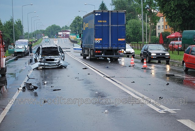 Jak wstępnie ustalono, na ul. Królowej Bony w Sanoku, kierujący osobowym bmw sygnalizował zamiar skrętu w lewo. Kierowca jadącej za nim ciężarowej scani prawdopodobnie nie zachował ostrożności i uderzył w tył bmw. Samochód osobowy siłą uderzenia został przepchnięty na przeciwny pas i tem uderzył w volkswagena i fiata uno. W wypadku ucierpiała jedna osoba, kierowca bmw.