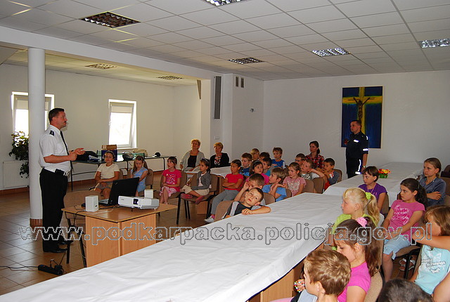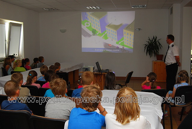 Policjanci odwiedzili dzisiaj dzieci na półkolonii w Rzeszowie zorganizowanej przez Stowarzyszenie na rzecz wszechstronnego rozwoju dzieci, młodzieży i dorosłych im. Błogosławionej Karoliny. Grupa 31. dzieci ze szkół podstawowych oglądała m.in. film o bezpiecznym zachowaniu się na drodze, świetnie bawiła się podczas edukacyjnych teledysków oraz rozmawiała o bezpiecznych zachowaniach w czasie wakacji. Dzieci brały czynny udział w dyskusji z policjantem, odpowiadały na pytania, mówiły o własnych doświadczeniach w poruszaniu się po drogach.