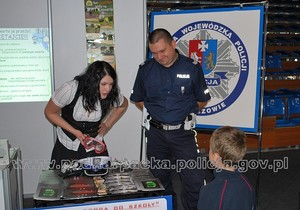 Każdy z odwiedzających policyjne stoisko otrzymywał też ulotki propagujące bezpieczne zachowania na drodze i mógł obejrzeć prezentację multimedialną na ten temat. Najmłodsi chętnie zakładali policyjną czapkę lub kask i siadali na policyjnym motocyklu.