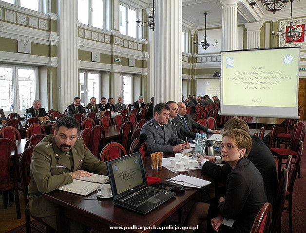 Wymiana doświadczeń i możliwości poprawy bezpieczeństwa na imprezach masowych – to temat narady, jaka odbyła się dzisiaj w Sali Kolumnowej Podkarpackiego Urzędu Wojewódzkiego w Rzeszowie. Spotkanie zorganizowane było w ramach rządowego programu „Razem Bezpieczniej”, jego współorganizatorem był Wydział Prewencji KWP w Rzeszowie.