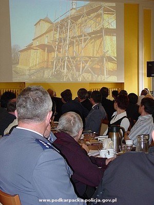 Z ogromnym zainteresowaniem spotkało się wystąpienie Grażyny Stojak - Podkarpackiego Wojewódzkiego Konserwatora Zabytków, która przedstawiła stan zabezpieczenia drewnianych obiektów sakralnych w naszym regionie. Podkreśliła, jak wielką wagę dla zachowania dziedzictwa narodowego ma otoczenie opieką cennych obiektów, spośród których najstarsze pochodzą nawet z XV wieku. Odnowienie cennych budowli, wyposażenie ich w systemy antywłamaniowe i przeciwpożarowe pozwoli uchronić je przed zniszczeniem. Następnie Dyrektor Krajowego Ośrodka Ochrony Zbiorów Publicznych w Warszawie - Piotr Ogrodzki przedstawił stan zagrożenia przestępczością skierowaną przeciwko zabytkom w skali kraju. Mówił jednocześnie o możliwościach i kierunkach prowadzenia działań zapobiegających. Przypomniał o tych najbardziej bulwersujących włamaniach czy aktach wandalizmu, a wśród nich o niedawnej kradzieży napisu z muzeum-obozu w Oświęcimiu.