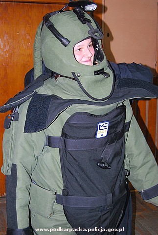 Po prezentacji wyposażenia policjantów prewencji do auli wjechał "inspektor" - policyjny robot. Razem z nim pojawili się też funkcjonariusze Samodzielnego Pododdziału Antyterrorystycznego Policji. Opowiedzieli młodym gościom o specyfice swojej służby i zaprezentowali elementy swojego wyposażenia. Policjanci urządzili pokaz umiejętności robota, każdy miał też możliwość spojrzeć w monitor, na którym wyświetlany był obraz widziany szklanym okiem "inspektora". Funkcjonariusze przynieśli z sobą również specjalny kombinezon policyjnego pirotechnika. Chętni mogli go założyć i przekonać się jak wiele wysiłku wymaga praca w takim ubiorze.