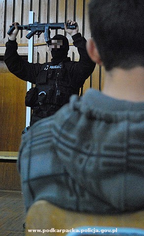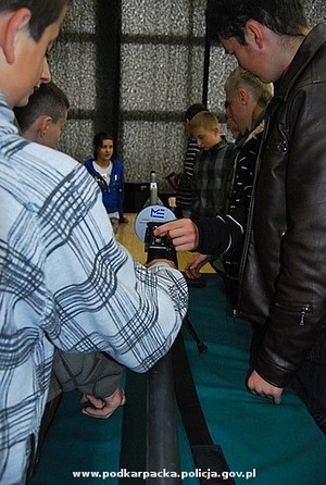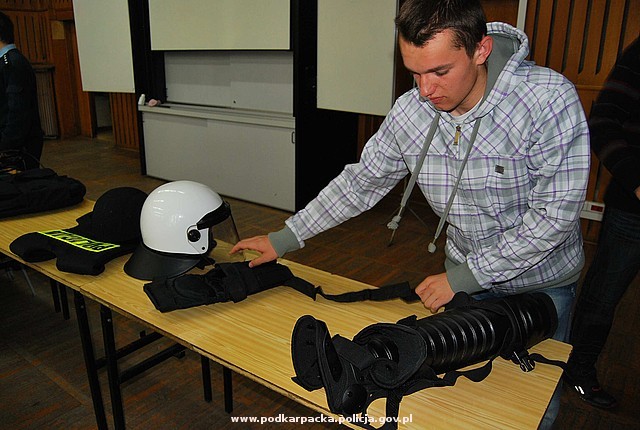 Dla 41 młodych ludzi z klasy 2 i 3 Gimnazjum im. Jana Pawła II w Wysokiej Głogowskiej policjanci przygotowali wiele atrakcji. Pogoda nie sprzyjała, dlatego spotkanie odbyło się w auli Oddziału Prewencji Policji w Zaczerniu. Uczniowie mogli obejrzeć z bliska policyjny sprzęt, przymierzyć kamizelki, hełmy, ochraniacze. Z zainteresowaniem przyglądali się też z bliska policyjnej broni.