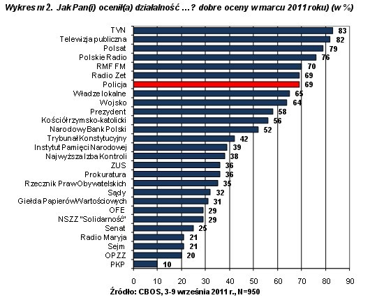 Policja znajduje się na siódmym miejscu z dwudziestu siedmiu ocenianych instytucji, wyżej od niej znajdują się tylko niektóre stacje telewizyjne i radiowe. Należy podkreślić, że Policja została oceniona zdecydowanie wyżej niż instytucje wymiaru sprawiedliwości, takie jak sądy i prokuratura – odsetek pozytywnych wskazań w przypadku Policji jest około dwukrotnie wyższy.